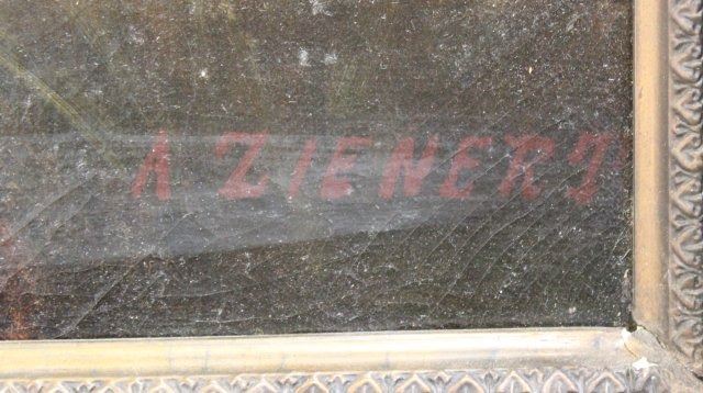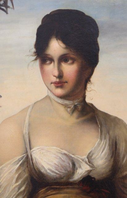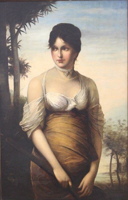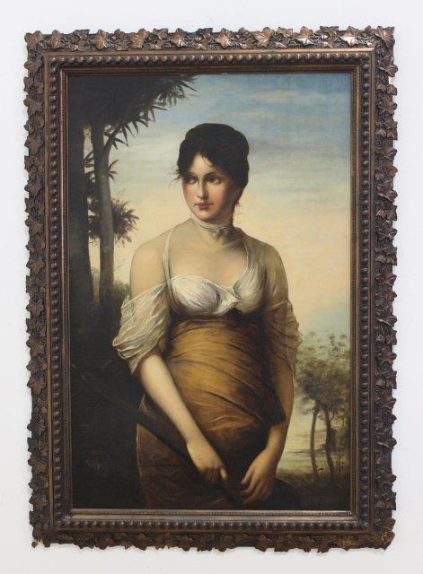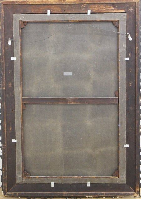Oil on canvas. Signed lower right. Appprox. 42" H x 27" W unframed, 50" H x 35" W framed. Relined. Restorations. Losses and repairs to frame.