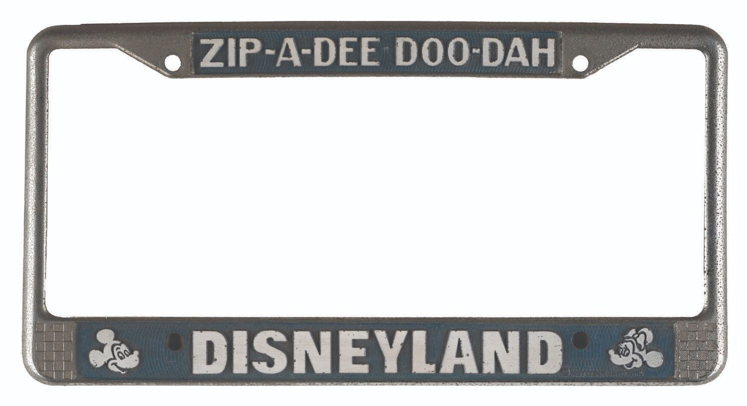 (Disneyland, 1960s-1980s) A Disneyland souvenir license plate frame featuring Mickey Mouse, Minnie Mouse, and the text, “Zip-A-Dee-Doo-Dah.” Measuring 6.75” x 12.25”, the license plate frame displays in good condition with scuffs, wear, and oxidation.
