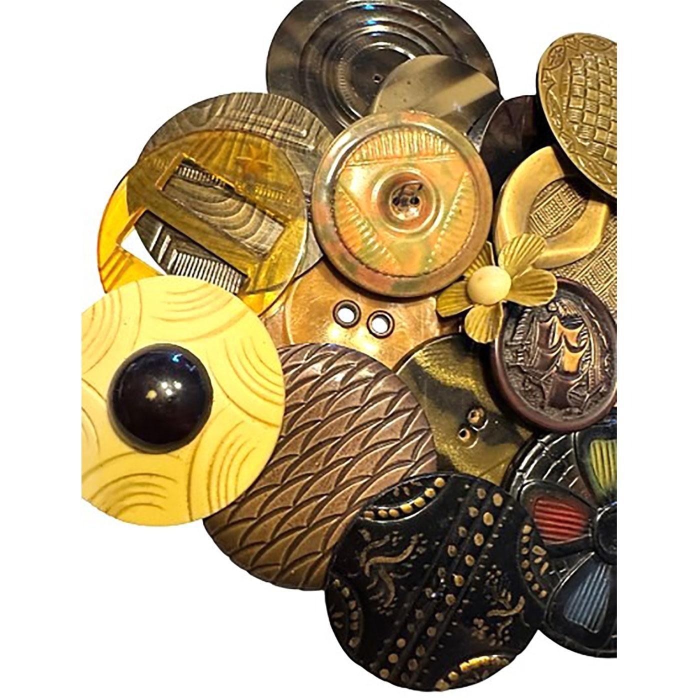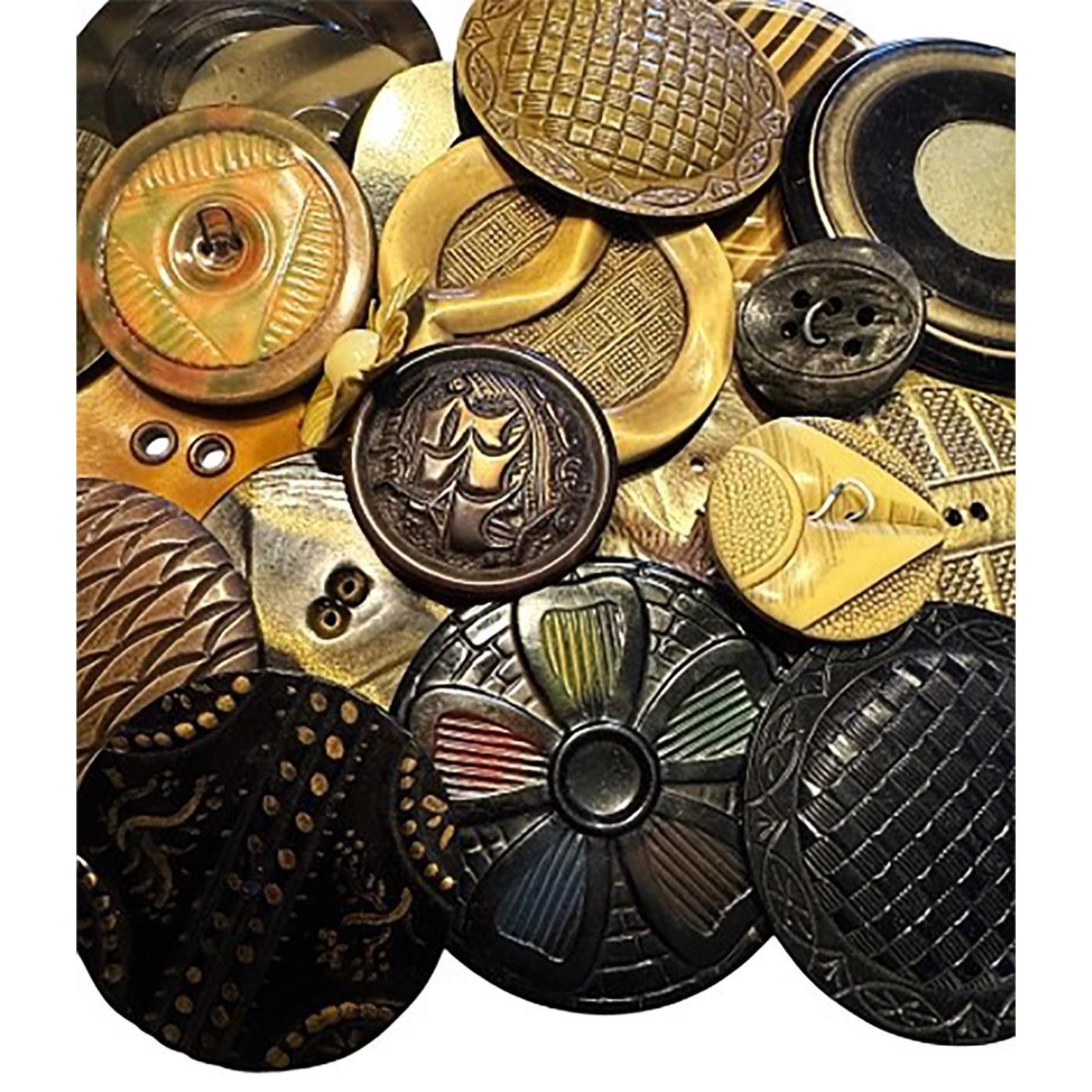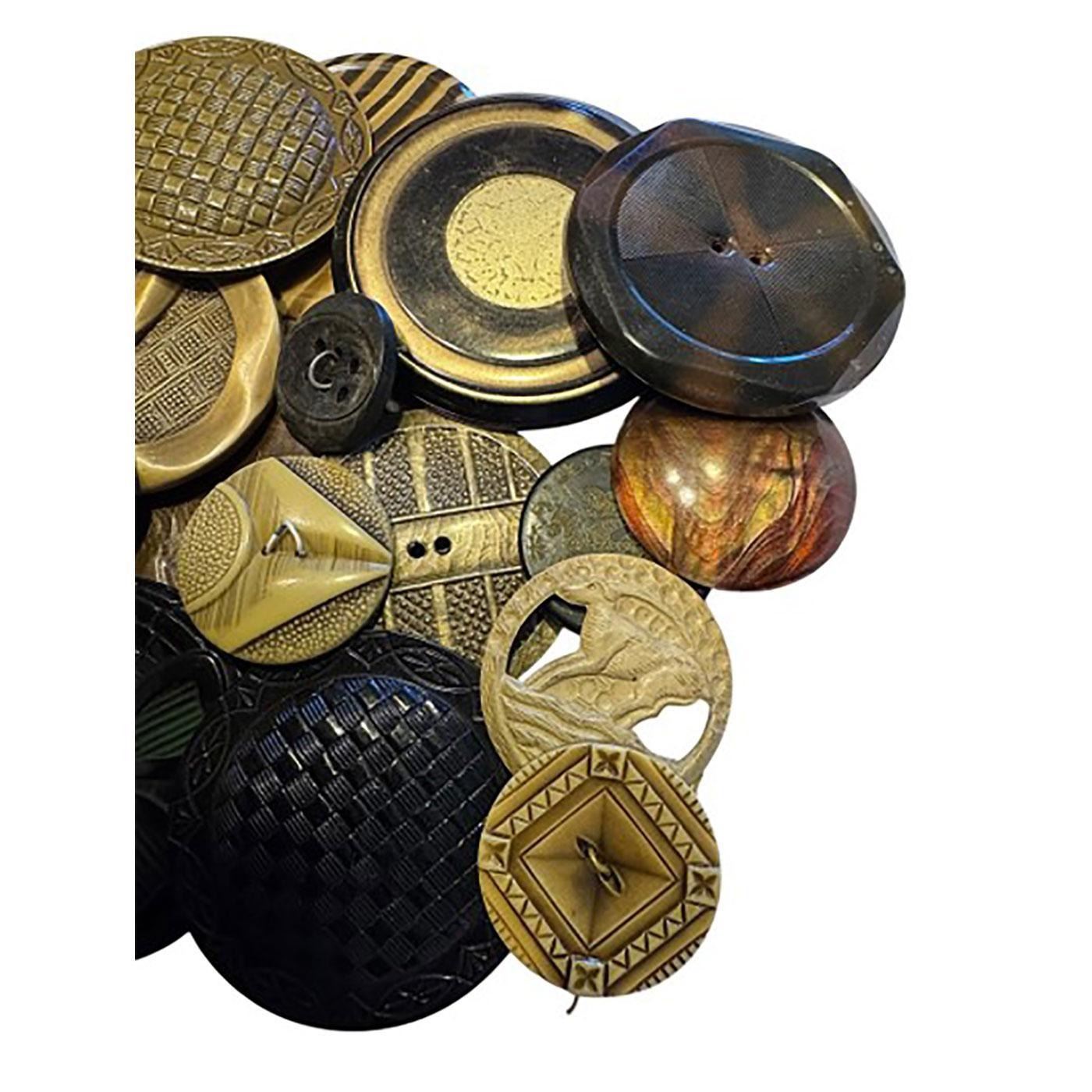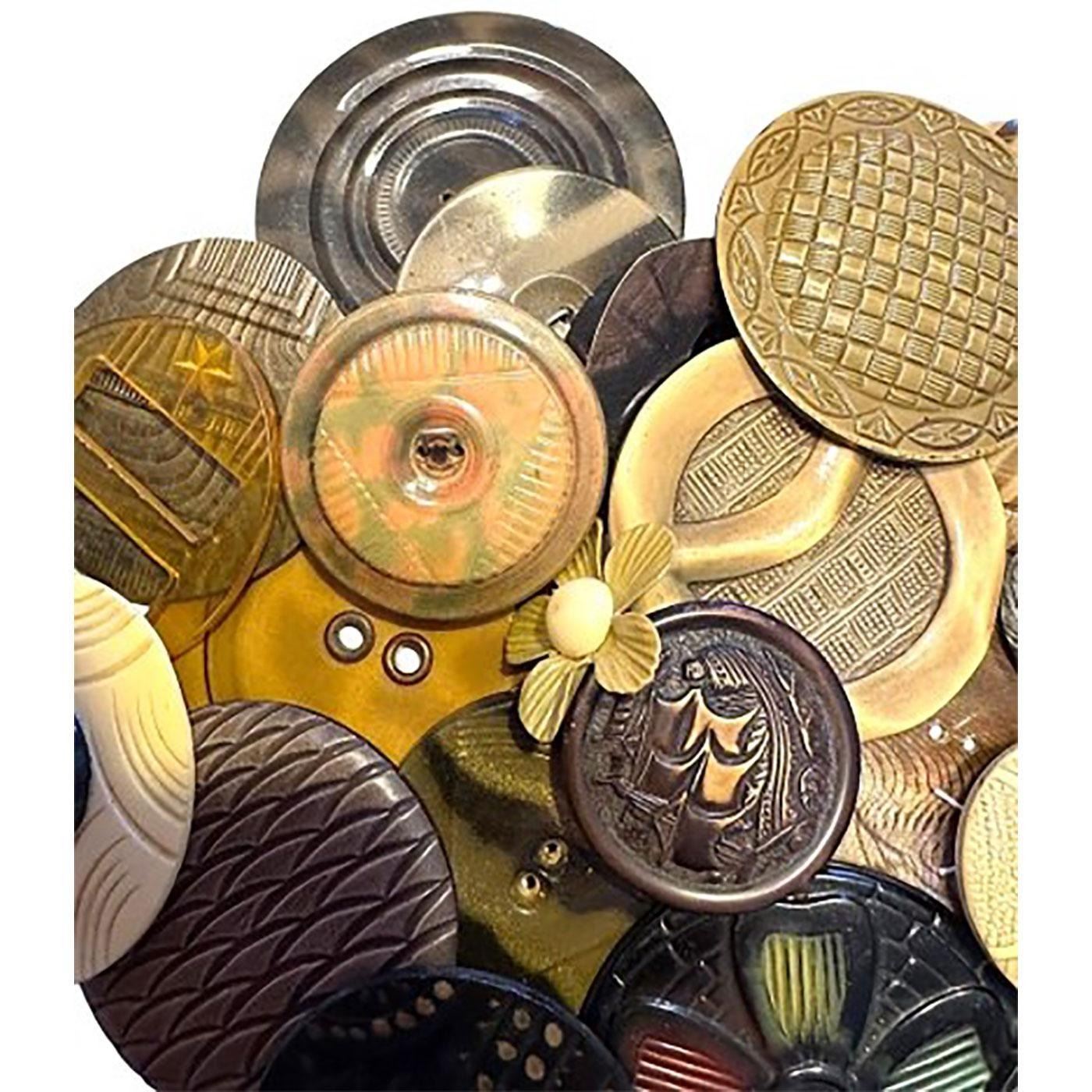 A large assortement of assorted celluloid style buttons. This bag lot includes over 2" examples, tight tops, wafers, 1 piece 30's and more.
