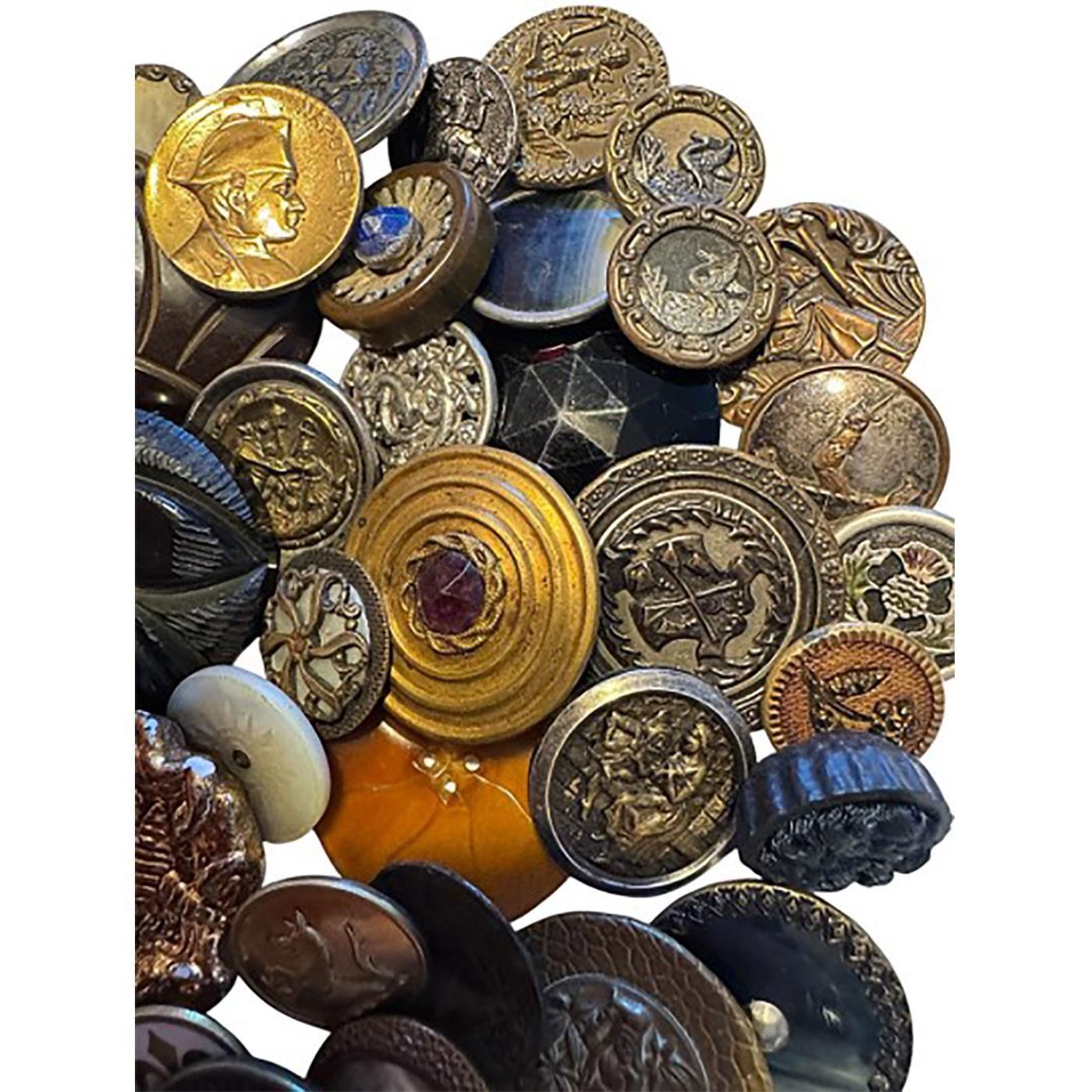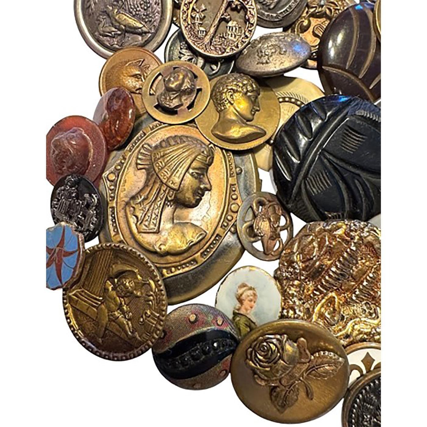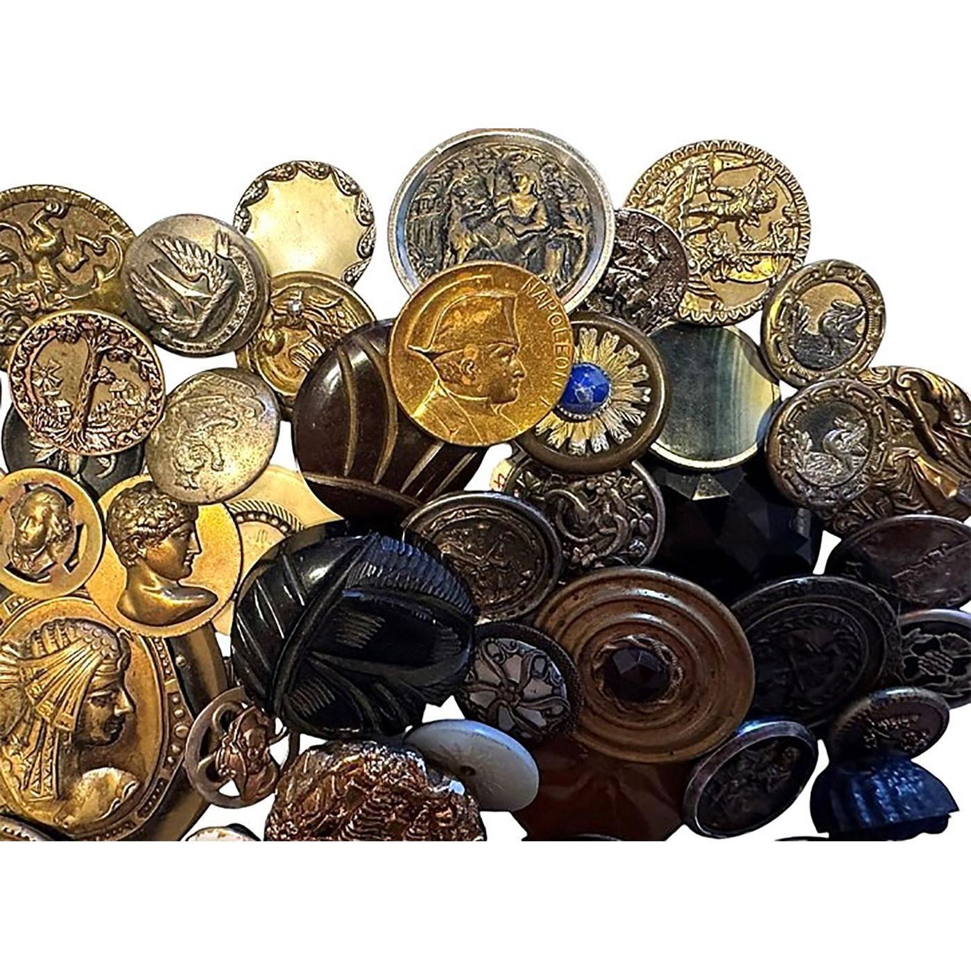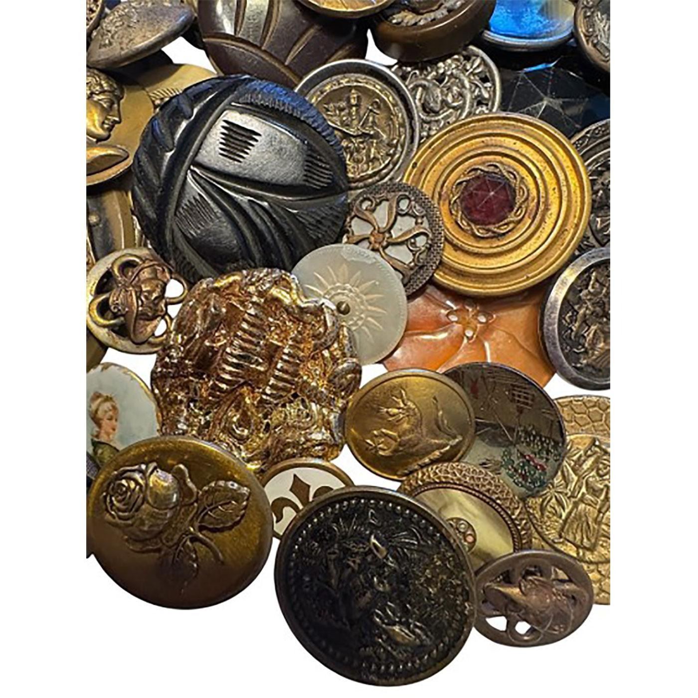 A large assortement of assorted material buttons. This bag is another bag full of a variety including metal pictures, Bakelite, Large jewels, Celluloid and more. Some great buttons in this bag look closely.