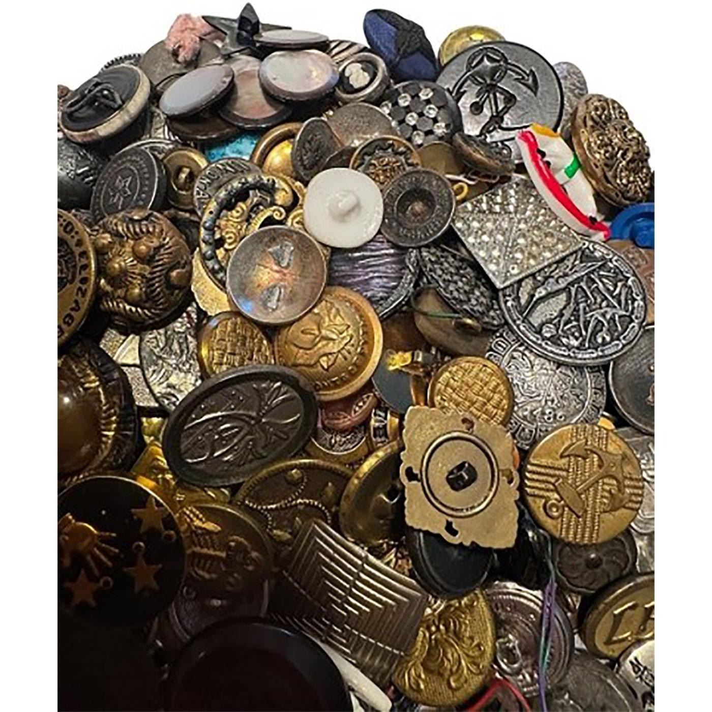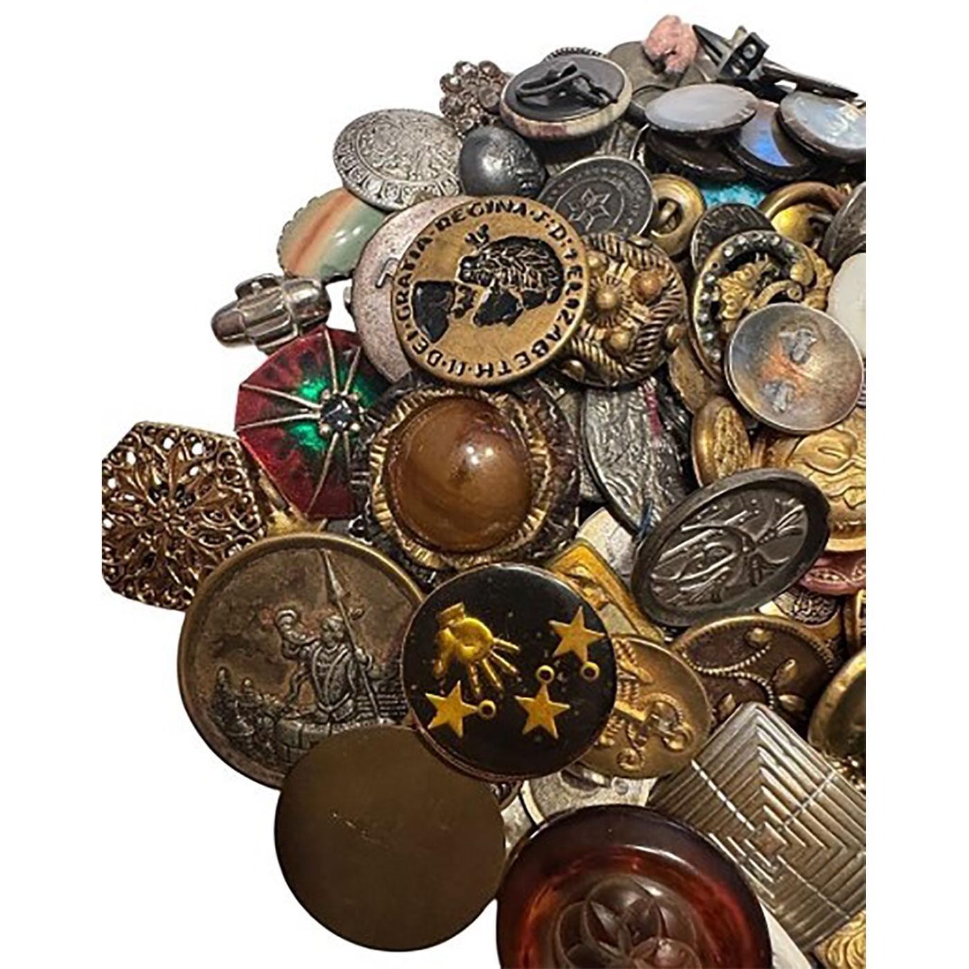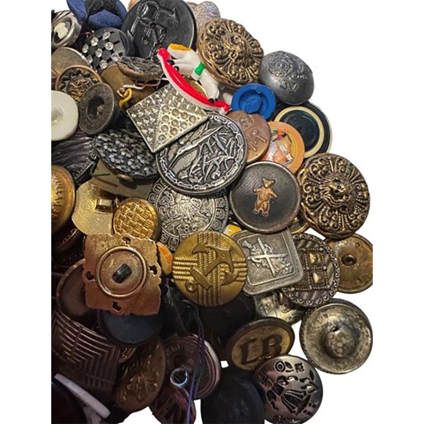 A multitude of assorted materials from the 19th & 20th centuries. This bag lot includes many pictorial metals along with plastics and other materials. Great variety.