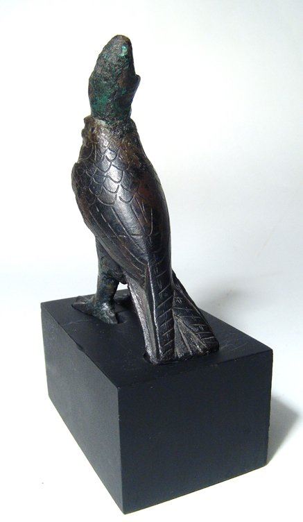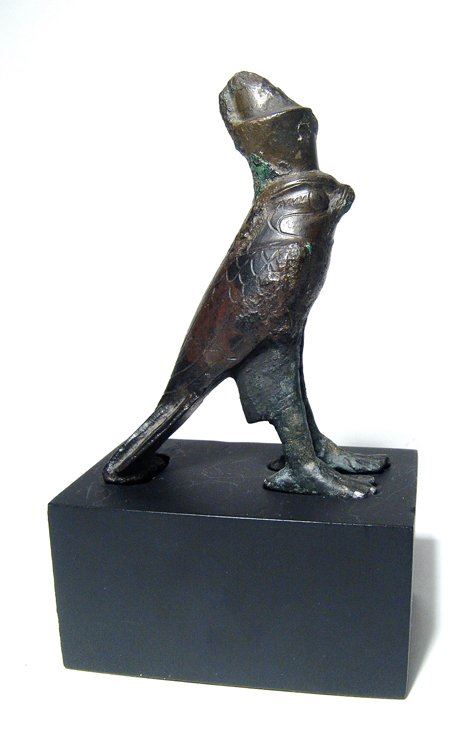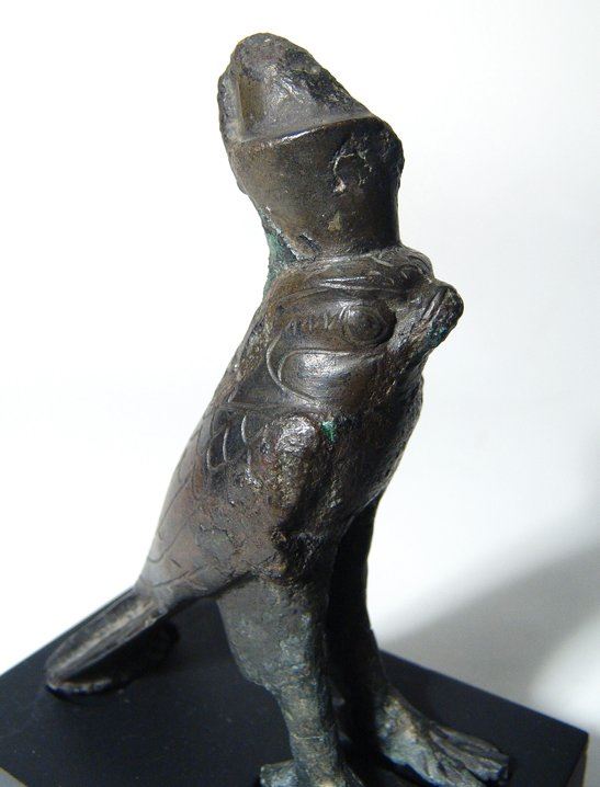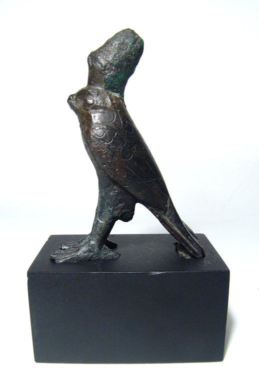 A beautiful Egyptian bronze figure of Horus, Late Period, c. 664 - 332 BC, in the form of a falcon, wearing the double crown of Upper and Lower Egypt, the features in fine style with incised details including the feathers. Figure only measures 4 1/8 in x 3 in (10.5 x 7.6 cm). Mounted on a custom base. Ex Spink and Son, c. 1963.