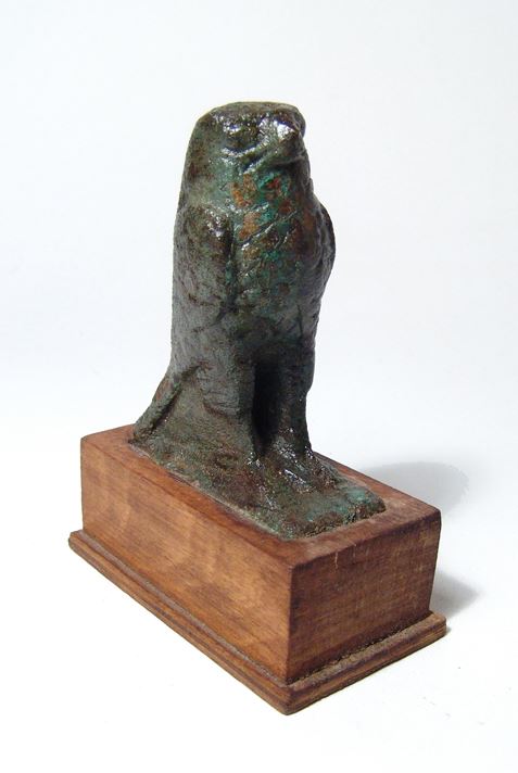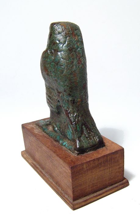 A beautiful little Egyptian bronze figure of Horus, Late Period, c. 664 - 332 BC, in the form of a falcon, the features in fine style with incised details including the feathers. H: 2 5/8 in (6.7 cm) - figure only. Mounted on an antique wood base. Ex Philadelphia private collection.
