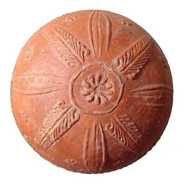 A beautiful Italo-Megarian bowl, c. 2nd Century BC, red-slipped, hemispherical in form, the base centered by a disk enclosing a rosette, from which radiates a composite floral of four nymphaea petals and four acanthus petals, with rosettes in between, a band of rosettes above. Intact. D: 4 1/2 in (11.4 cm); H: 3 in (7.6 cm). Ex Orange County private collection. A lovely piece!