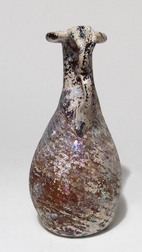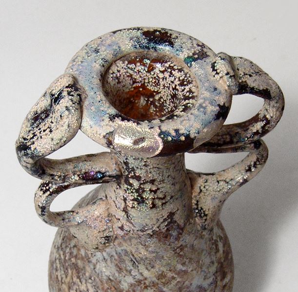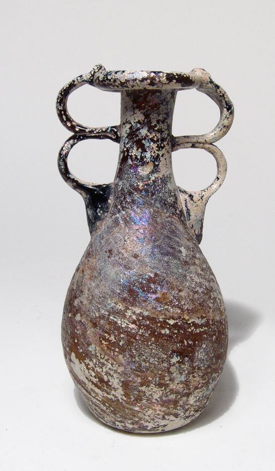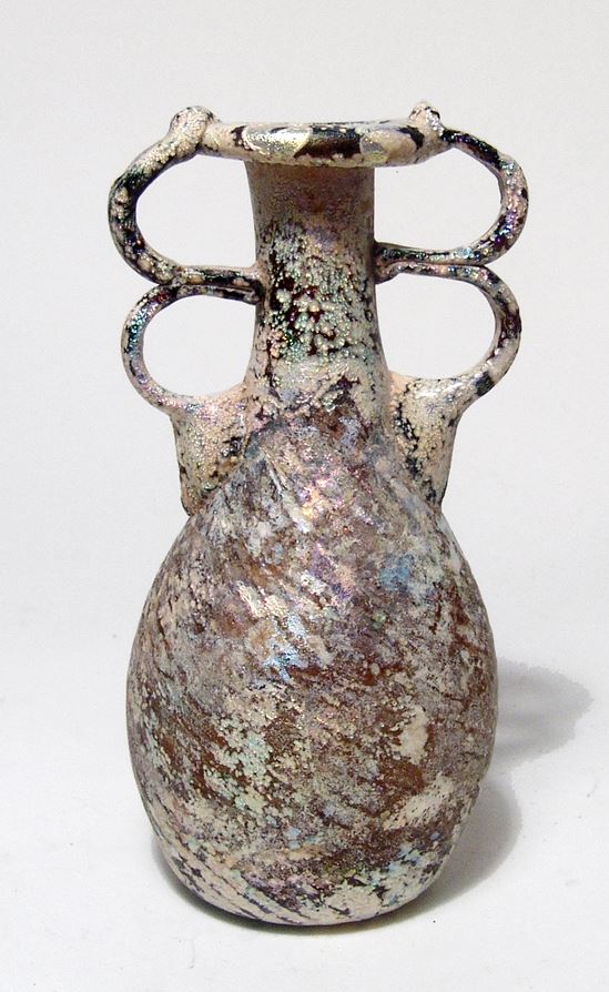 A beautiful Roman amber glass flask, c. 2nd Century AD, the pear-shaped body with indented base, the sides decorated with swirling vertical ribbing, the narrow neck surmounted by a wide flat base and a pair of loop handles on either side. A lovely example with gorgeous silvery iridescence. H: 5 5/8 in (14.3 cm). A more interesting and unusual type with the four handles. Ex Los Angeles collection; Ex Jerusalem Gallery with copies of export documents.