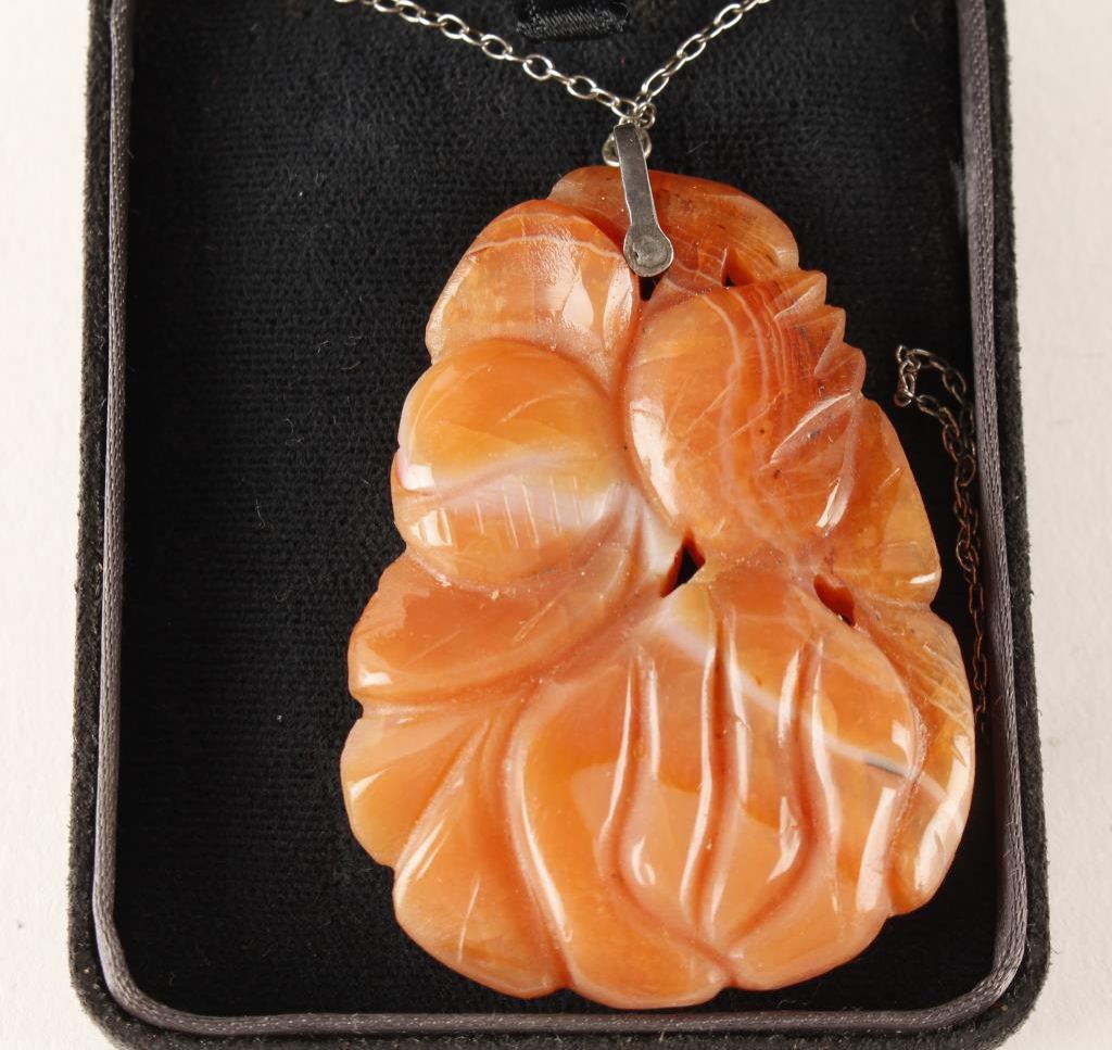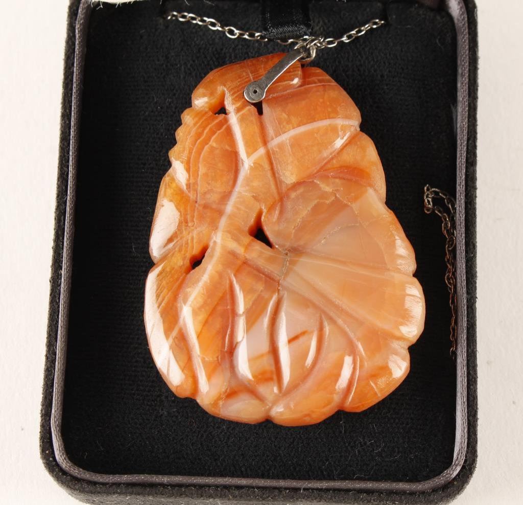 A beautiful carved stone pendant, rose color with variegated white color; on chain. Est.: $300-$600.
