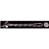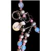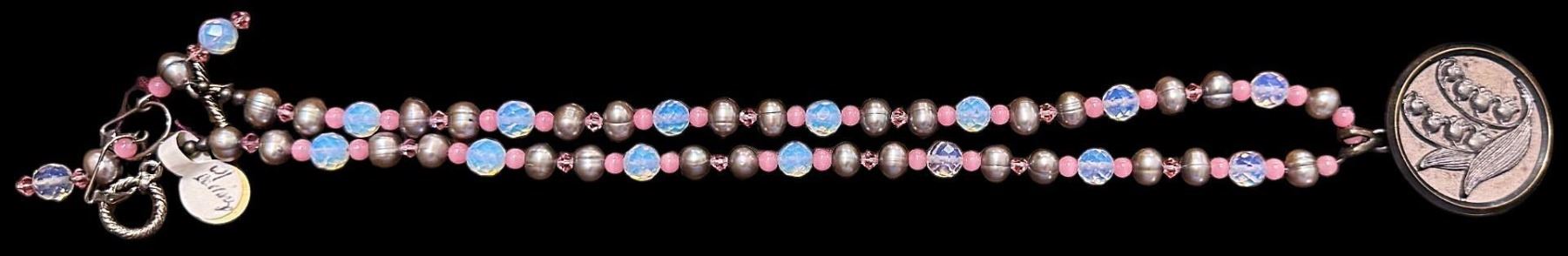 1 Long crystal glass example with a floral button. This beautiful pink and iridescent beaded necklace is adorned with a 19th century brass and pewter Lily of the valley button.