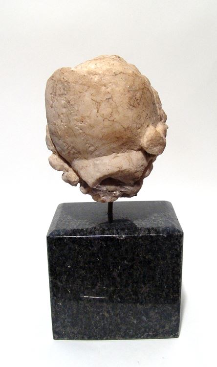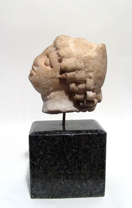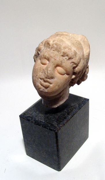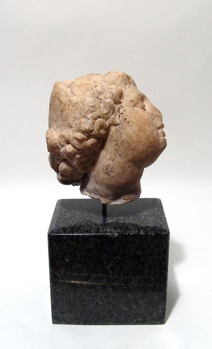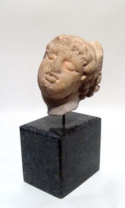 A beautiful marble head of an enraptured Venus, c. 2nd Century AD, likely once part of a paired statue with Pan, the goddess of love’s head tilted slightly back and to the left in an expression of pure delight, her eyes looking upwards, her lips in full bloom, and her hair trailing down her back. The neck with the telltale rings of Venus. Height of head alone: 4 ¾” (12.2 cm), mounted on stand: 10 3/8 in (26.5 cm). A few minor nicks and such, light deposits. A truly delightful piece! Ex Estate of Hope N. Efron, Washington DC. Appraised by Evang. M. Vitali-E. Kazarossian, Pandrossou, Athens on July 6, 1964. Efron worked as an economist at the Department of Labor’s Bureau of Labor Statistics. She received special commendations for her volunteer work with the American Councils for International Education and Youth for Understanding.