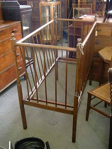 A beech child's cot, with spindle supports, on square legs, H 111cms L 121cms...