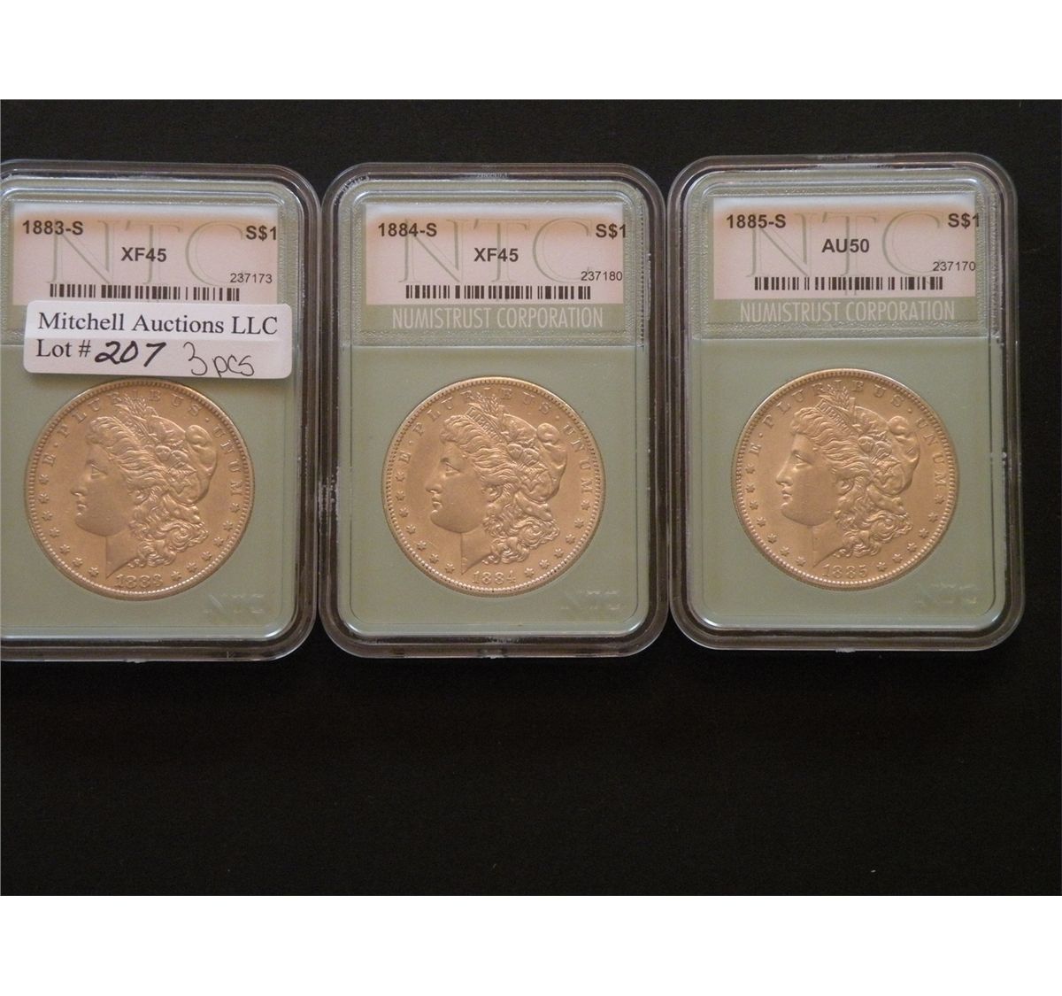 A better date San Francisco Mint Morgan Dollar threesome: 1883-S NTC XF45; 1884-S NTC XF45; 1885-S NTC AU50. A total of 3 coins. Est$125