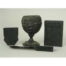 A black Irish watch case, a card case, paper knife, and a carved coconut cup.(4) Est.50/80