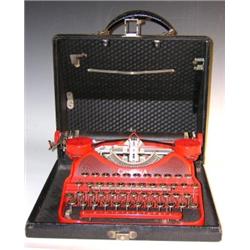 A black leatherette cased red Corona portable typewriter, the qwerty keyboard above the label 'LC Smith & Corona Typewriters Inc' £60-80
