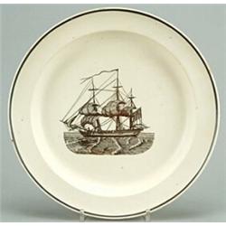 A black-printed creamware ship plate, decorated with a view of a three-masted sailing ship within a simple black-lined border, diameter 24.8cm, unidentified impressed initial mark "S & W", circa 1795-1815