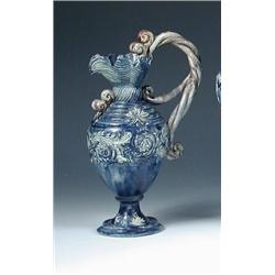 A blue baluster ewer, the feather incised petal rim with a bird beak spout opposite a three curl thumbpiece to the rope handle, three further mauve curls below on the ribbed shoulders, the body modelled with foliage rinceau band, the foot with four stellate leaves, castle sprig mark, 42cm high £150-200