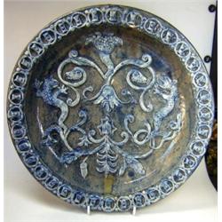 A blue strapwork dish, the rim applied with blue glazed white clay chain enclosing a cornucopia above a mask flanked by ramsheads being frightened by mythical beasts, all linked by tendrils or snakes above anthemion between acorns, incised and castle sprig marks, 34cm diameter £120-180