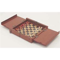 A bone travelling chess set, the small turned pieces in natural and stained in a folding mahogany box, 8 ins. £60-80