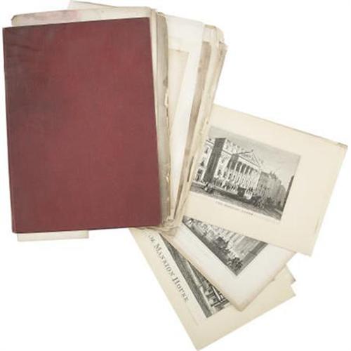<B>A BOOK CONTAINING PRINTS OF BRITISH LANDMARKS</B></I><BR> <BR>A hardcover book containing approximately 130 loose prints, all depicting various British landmarks and monuments, principally in London. Some repetitious prints. Examples include: <I>The Mansion House</B></I>, <I>Macclesterfield Bridge</B></I>, <I>Mercers Hall</B></I>, <I>Middle Row</B></I>, <I>The New Mint</B></I>. Spine of book labeled: <I>LDN</B></I>.<B>Condition Report:</B> Heavy surface dirt, staining, discoloration and foxing, water damage and staining to some pages where book cover bled, worn edges.<BR><BR><b>Shipping:</b> Books & Catalogs (<a target="_blank" href="http://www.heritageauctions.com/common/shipping.php">view shipping information</a>)
