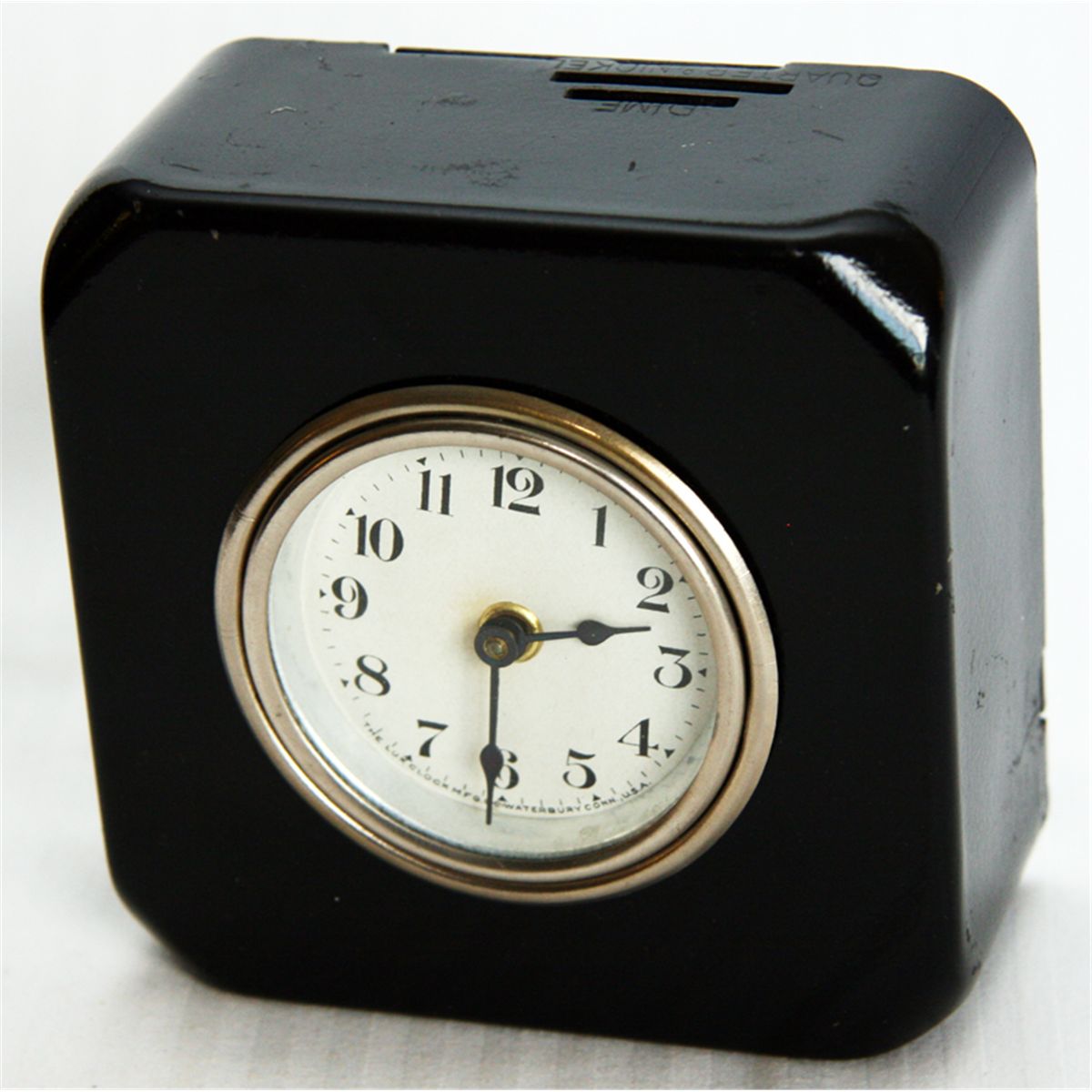 A box shaped Clock Bank. Separate slots for 10, 25 Cents at top, and banknotes on the side. 10cm x 10cm x 5cm. Black metal finish, with clock in front. Mutual Life, etc, on bottom. VF.