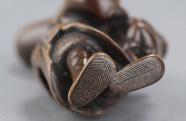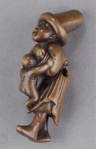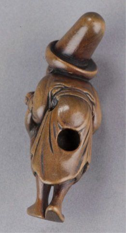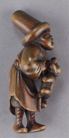 Late 18th century. Mid-stride, his hands clenched in front of him as he supports a monkey that hangs from his arms. He wears a tall round hat with a large rolled brim and there are slight signs of wear to his face but the hat and parts of his robe are patinated to a reddish hue. The himotoshi are large with one being considerably larger than the other. 2 7/8in (7.4cm). Provenance: Purchased in Tokyo, 1951.