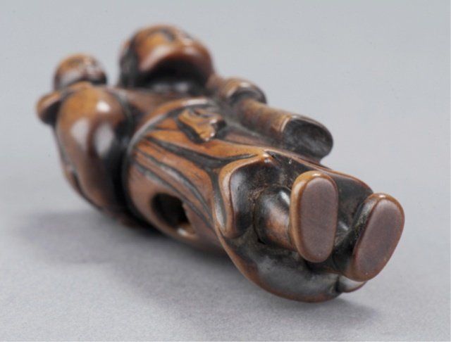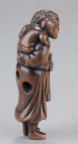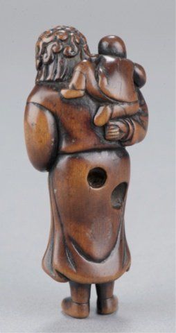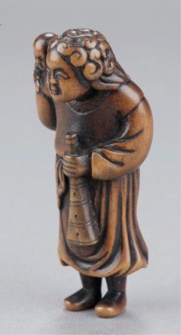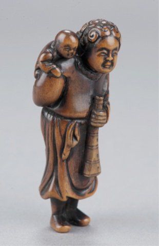 18th century. Standing and looking to his right while holding a trumpet in his left hand and a small Japanese child on his back, the boxwood is slightly worn and of good color. Unsigned. 3 1/4in (8.3cm). Provenance: Sotheby's, London, August 1, 1973; Lot 62.