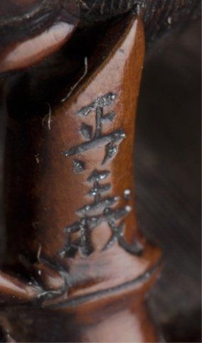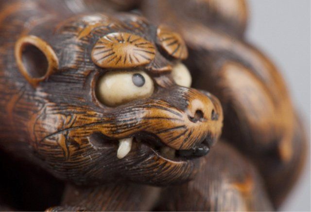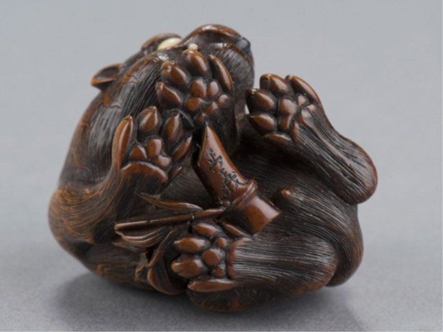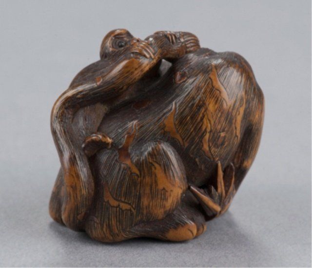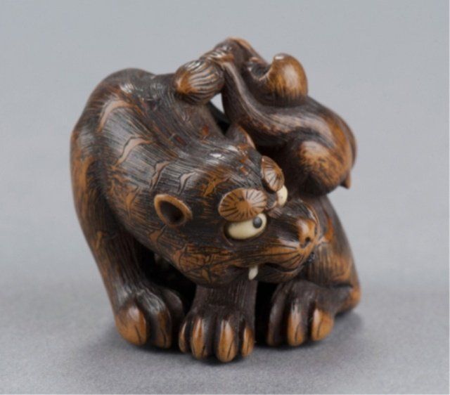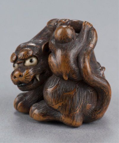 By Sato Masayoshi (1819-1865), Nagoya, Mid 19th century. The tiger crouching over a length of bamboo while the small monkey seated on the tiger's back plays with the latter's long tail, the eyes are inlaid in ivory and horn, the fangs in ivory and the tongue is carved from ebony. Signed on the bamboo, Masayoshi. 1 3/8in (3.5cm). Provenance: Ex M.T. Hindson collection, Sotheby's, London, March 16, 1968; Lot 423. Ex W. L. Behrens collection, No. 2791. Ex Gunther collection, No. 1806. Ex Gaskell collection, No. 789