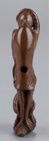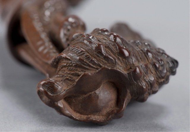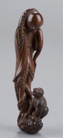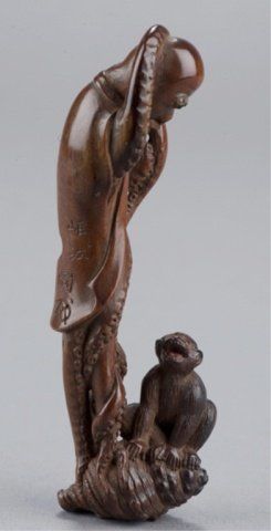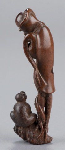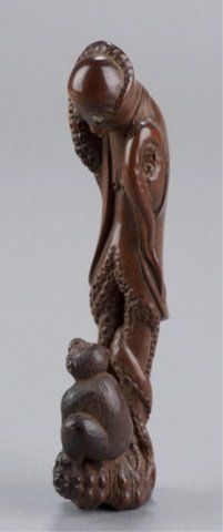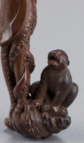 By Tanaka Minko (1735-1816), Tsu, Mid 18th century. The standing octopus with eyes inlaid in dark horn with black pupils looking down at monkey with mouth and eyes colored red, the eyes with black pupils. Signed on the reverse to the right of the himotoshi, Minko, plus seal and Kakihan.4in (10.2cm). Provenance: Purchased from Joseph U. Seo, 1960.