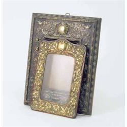 A brass photo frame, decorated with a cartouche crest and tendril like flowering and fruiting vines, together with a smaller brass photo frame, 10.5 ins £60-80