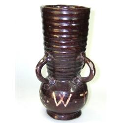 A brown four handled vase, the horizontally ribbed cylindrical neck tapering to the lug handles attached above the globular body with white initials for the saying 'Where There's a Will There's a Way' incised within the footrim around the castle sprig mark, 21cm £50-70