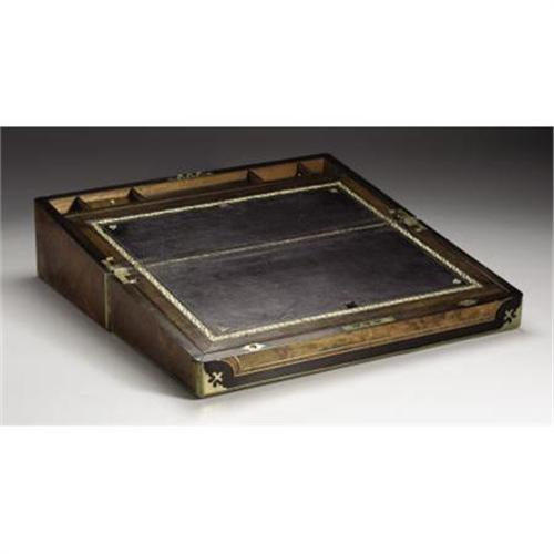 <B>A Regency Burl Walnut and Brass Lap Desk</B></I><BR>Unknown maker, England<BR>Circa 1800-1820<BR>Burl walnut, rosewood, ebonized wood, brass<BR>Unmarked <BR>7 inches high x 20 inches wide x 10.25 inches deep (closed)<BR> <BR>With burl walnut ground, the top and front with ebonized border with incurving corners, with band of rosewood between brass stringing, edges with brass mounts and stylized fleur-de-lis at corners, the top with inlaid brass cartouche reserve, the front with cartouche shaped brass inlaid escutcheon; the interior with black gilt edged leather inset to writing surface, three hidden drawers, pen holder, and two covered containers with ivory pulls.<B>Condition Report:</B> Normal signs of wear as appropriate with age; one interior cover missing.<BR><BR><b>Shipping:</b> Miscellaneous Collectibles, Larg (<a target="_blank" href="http://www.heritageauctions.com/common/shipping.php">view shipping information</a>)