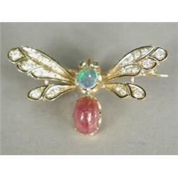 A butterfly brooch set with diamonds, emeralds, a cabochon ruby and an opal doublet, in yellow metal (test gold), 4.5cm long Est. 250/350