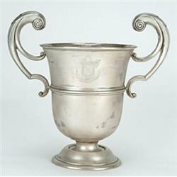 A campana shaped trophy cup with two leaf capped flying scroll handles, a moulded girdle on round...