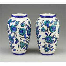 *A: can you put a /\ accent over the 1st "i" in "La Maitrise"?* Pair of BOCH FRERES ovoid vases with enameled stylized floral motif, "La Maitrise", in shades of blue on a white crackled ground. Stamped mark, artist's cipher and D.894. 14" x 5" $600 - 900