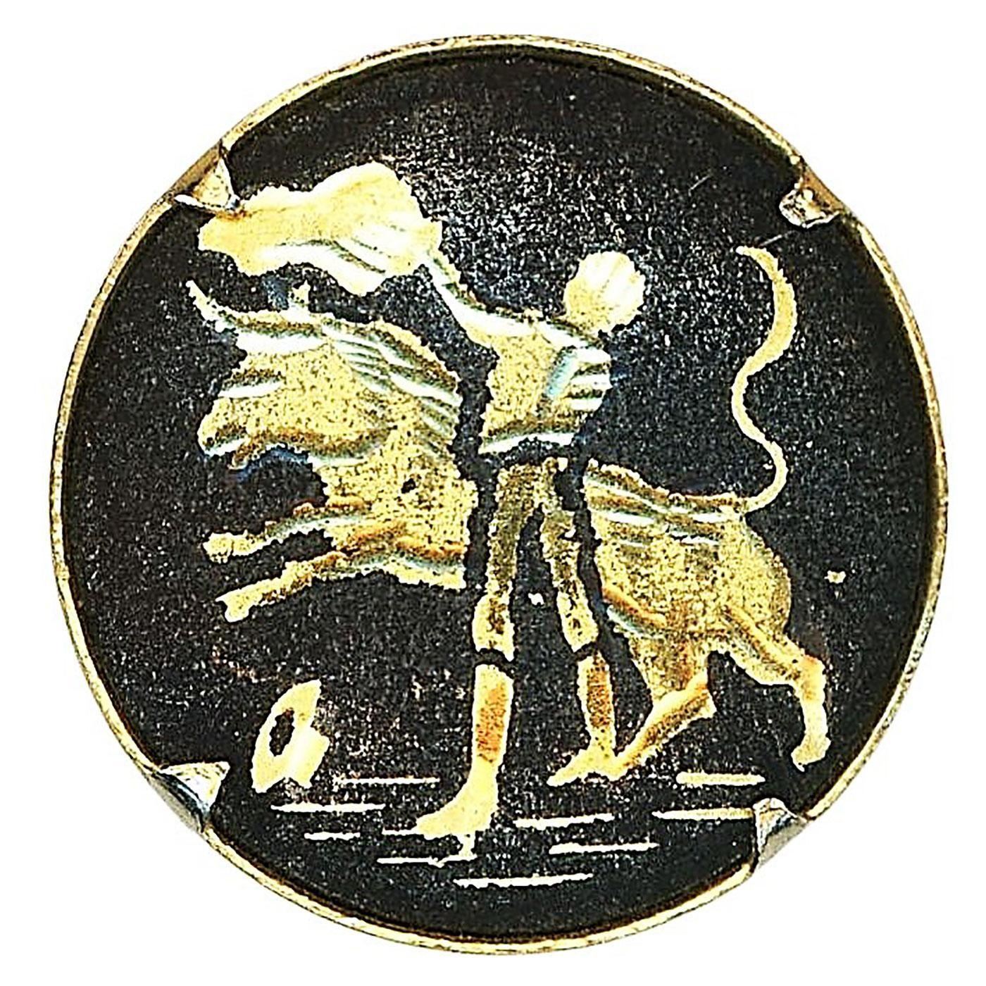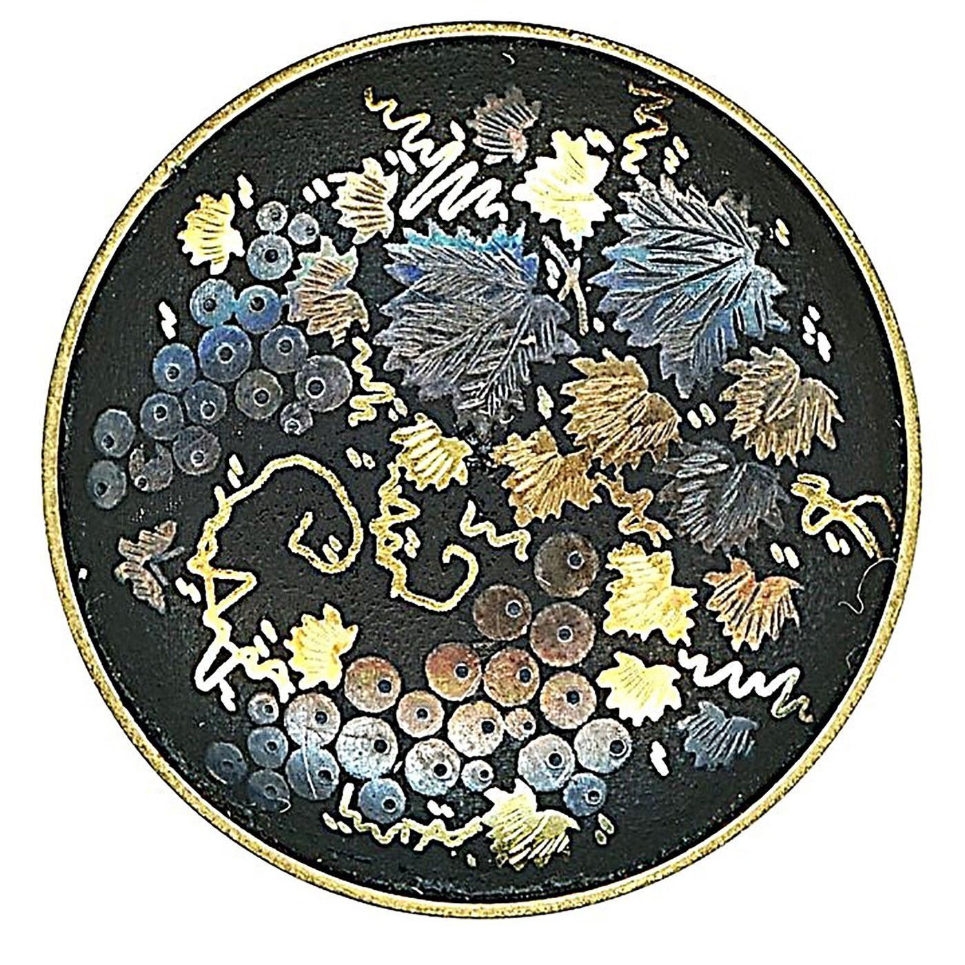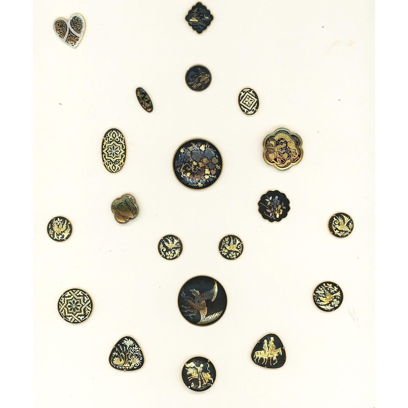 20 Small/Medium size assorted subject matter Damascenes. These Vintage and modern examples found on this card represent a variety of shapes, patterns and pictorials all in the Japanese technique of Damascene. Damascene was originally developed in Syria over 1500 years ago but buttons were not made in this technique until the late 1800's and then in the 20th century in Japan as well as in The United States with the studio example we find by Mario Ballesteros. The examples on this card all date to the early part to mid part of the 20th century and include no studio.