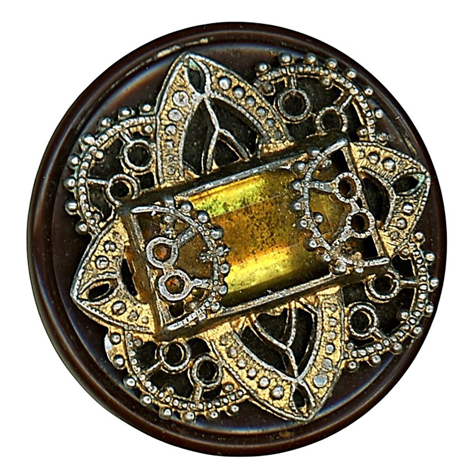 14 Large 19th and 20th C. glass in metal incl. Bakelite. This card of glass in metal includes a variety of colored stones and also includes two jeweled Bakelite coat button.
