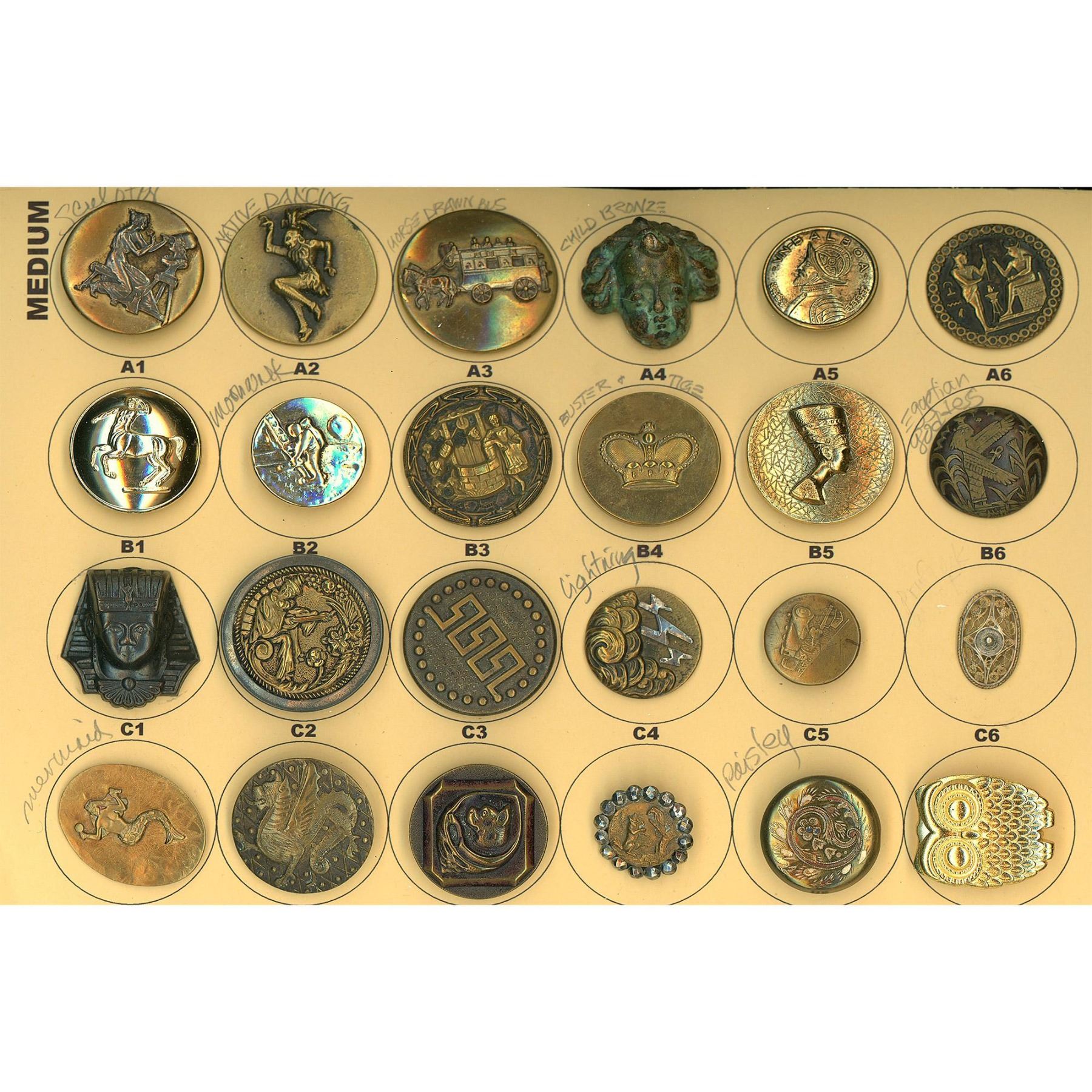 24 Medium 19th-20th century metals including many pictorials. Here is a nice collection of metal buttons including many picture examples and patterns.