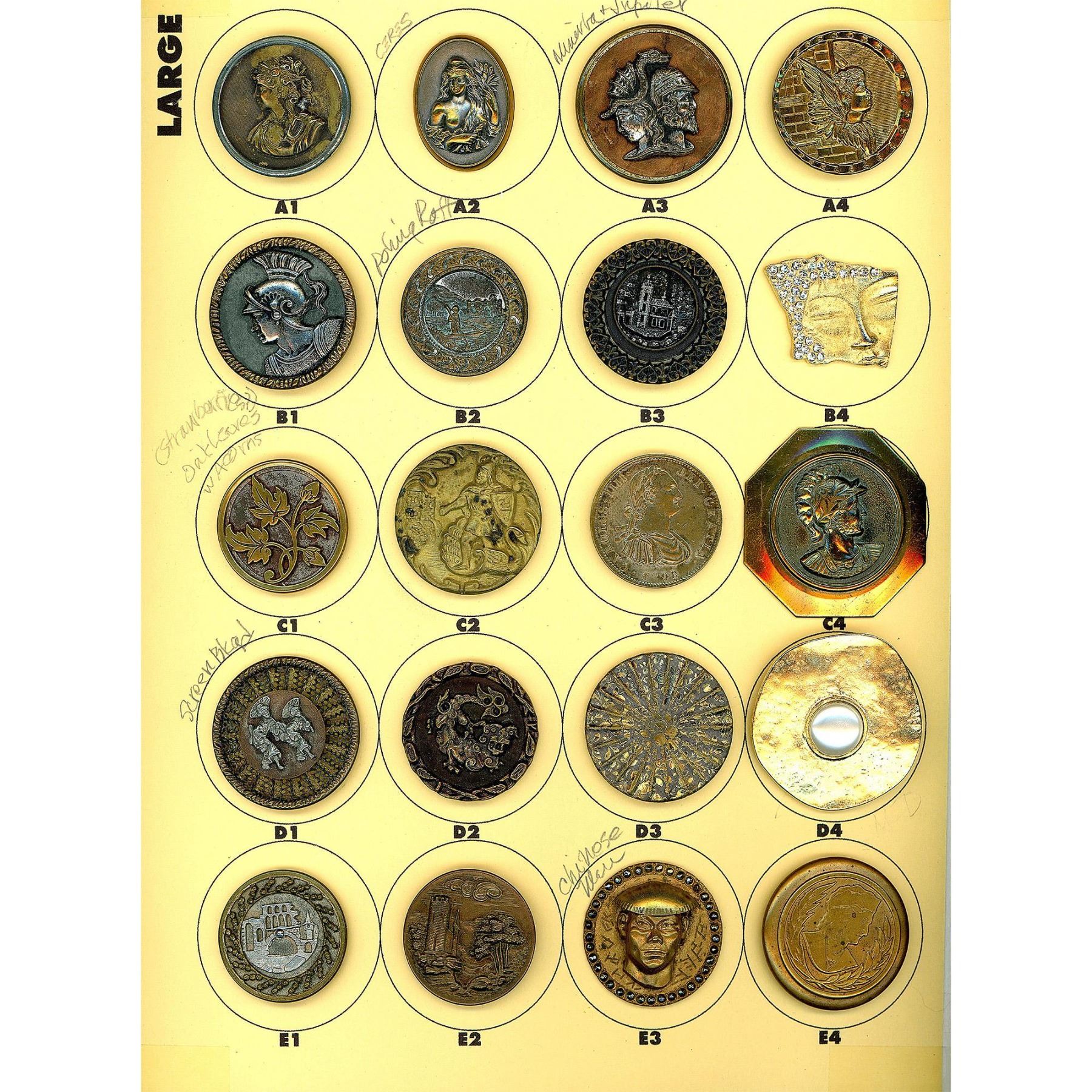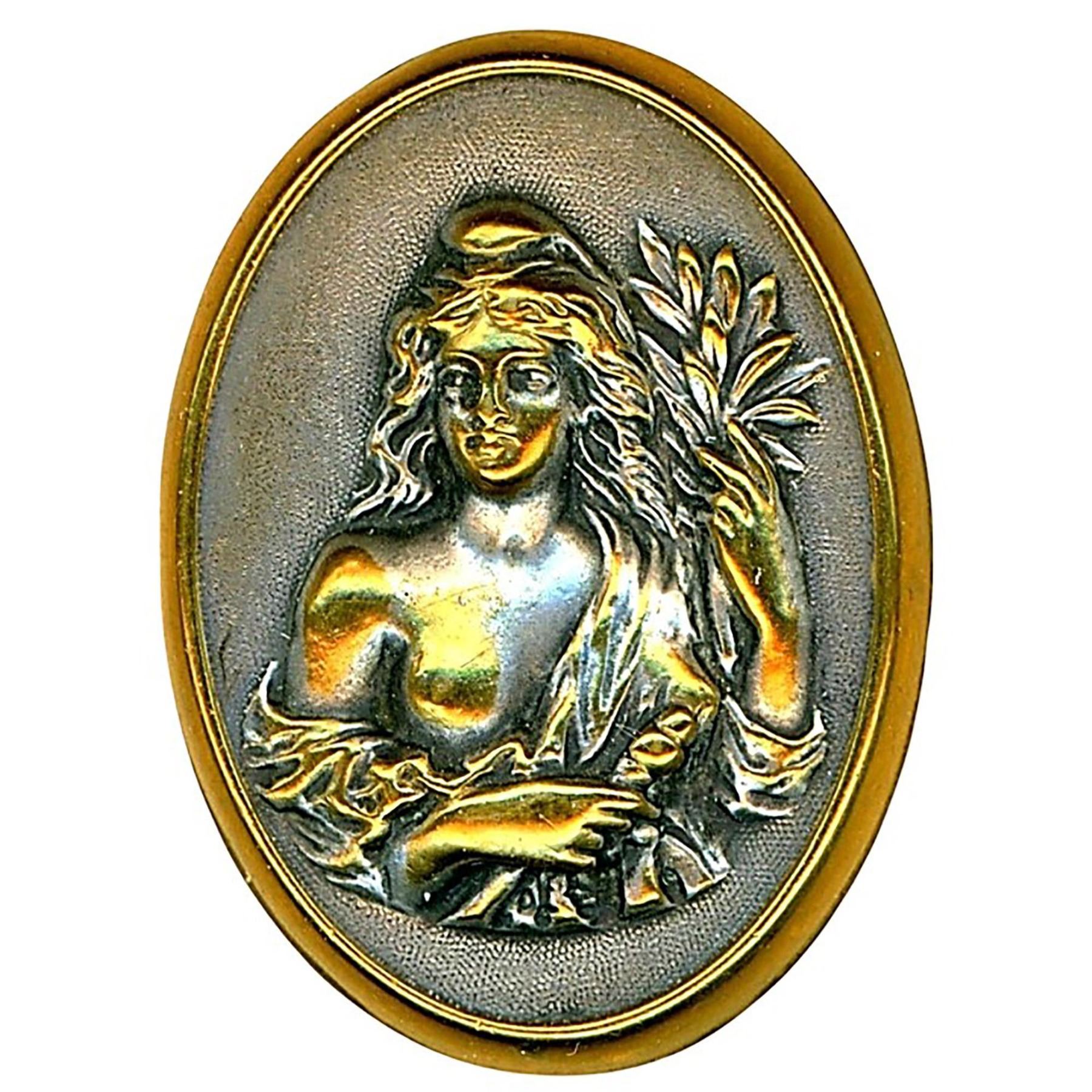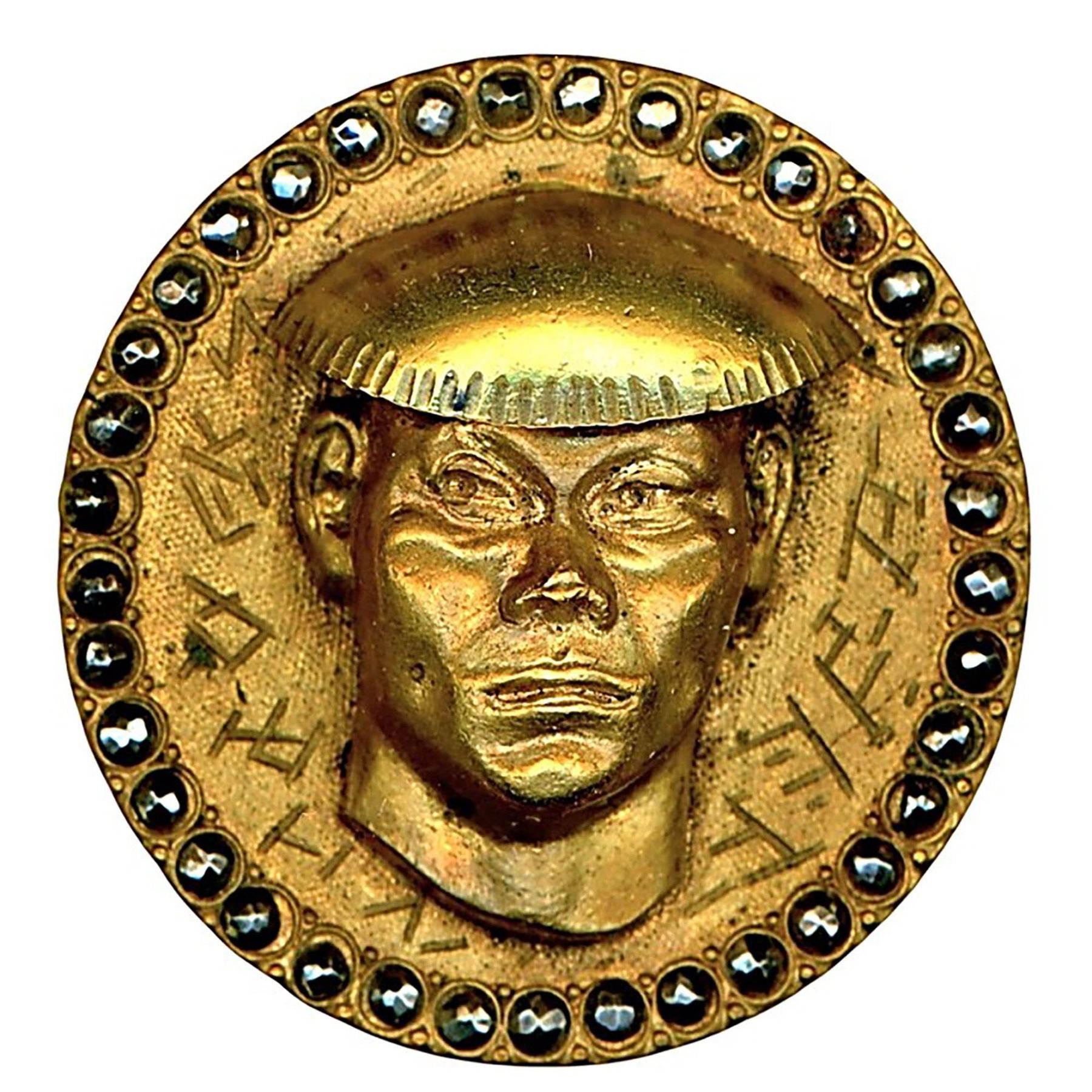20 Large 19th-20th century metals including many pictorials. Here is a nice selection of metals including several nice 19th century picture buttons, a cool shaped gilded brass 20th century face with brilliant pastes and more.