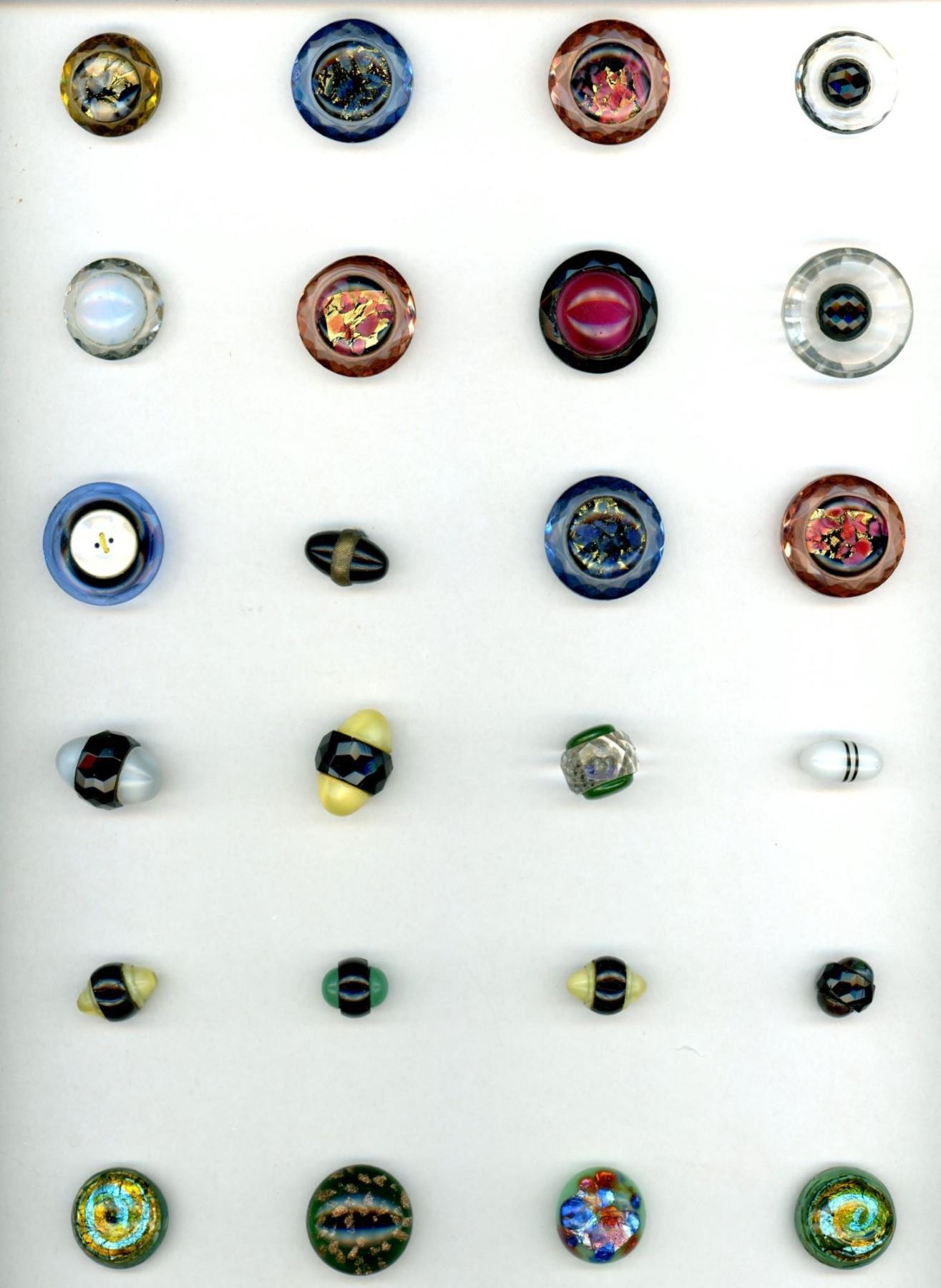 24 Medium size 19th-20th century assorted examples. This card includes several styles and techniques including several foil imbedded and several veil style glass examples. All in a variety of colors.