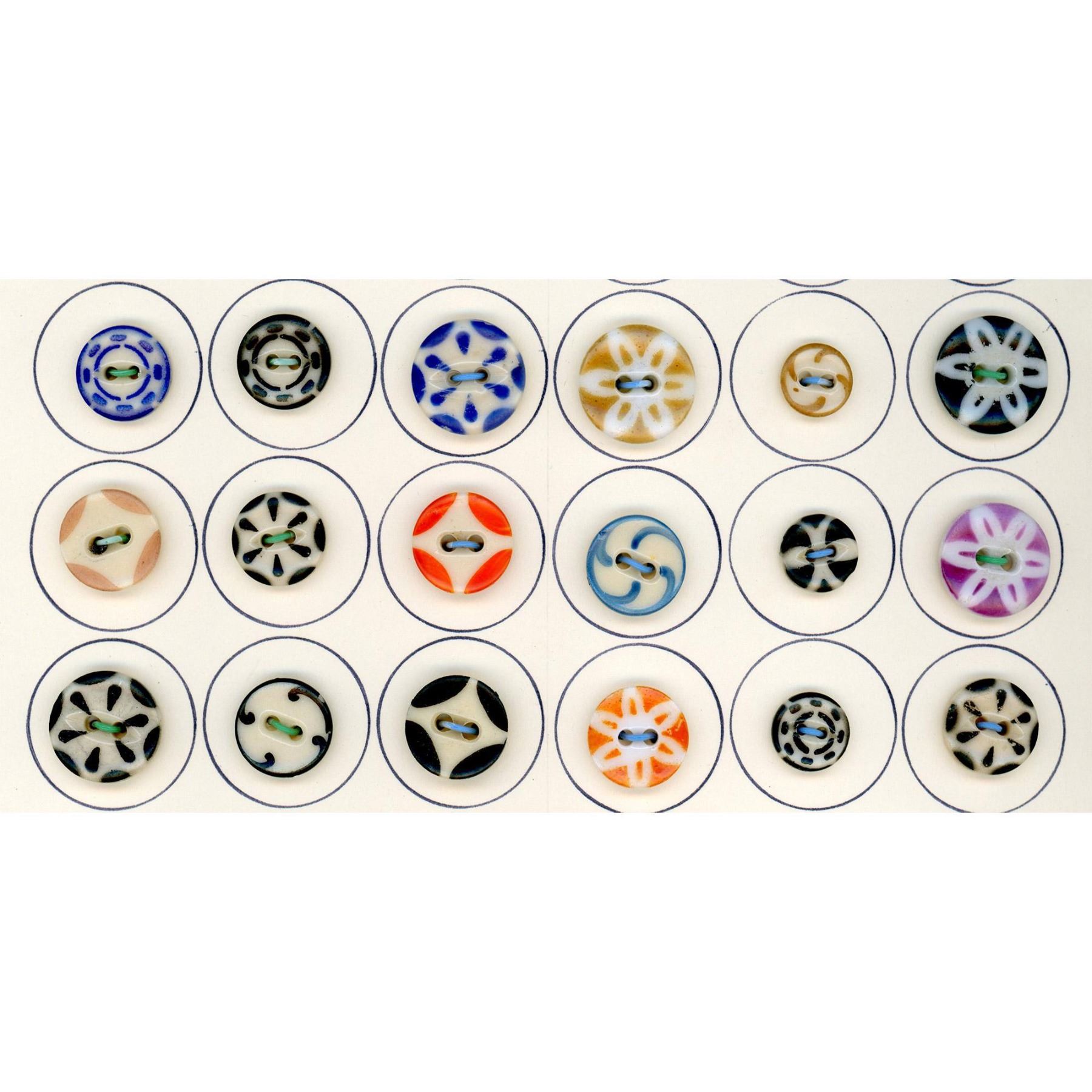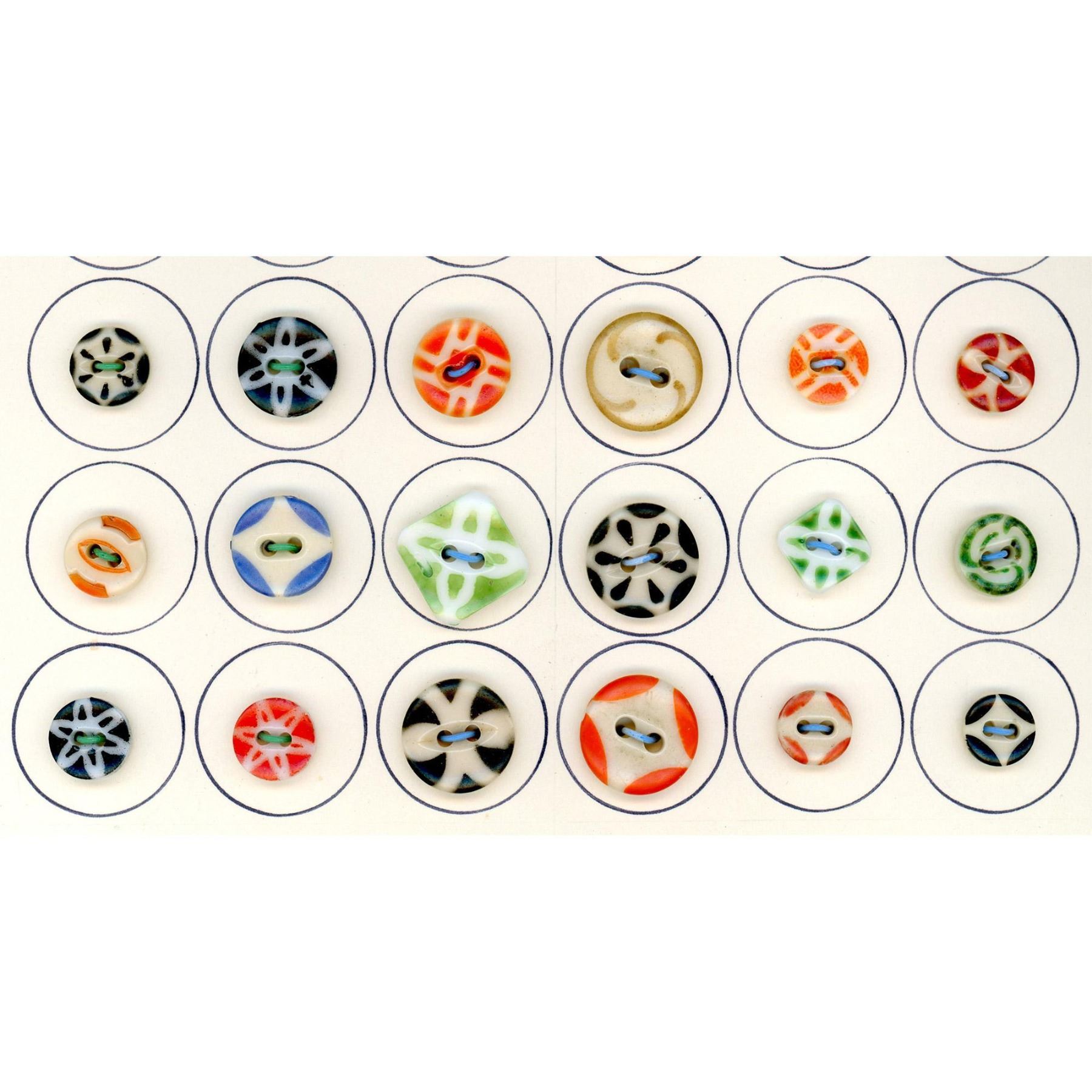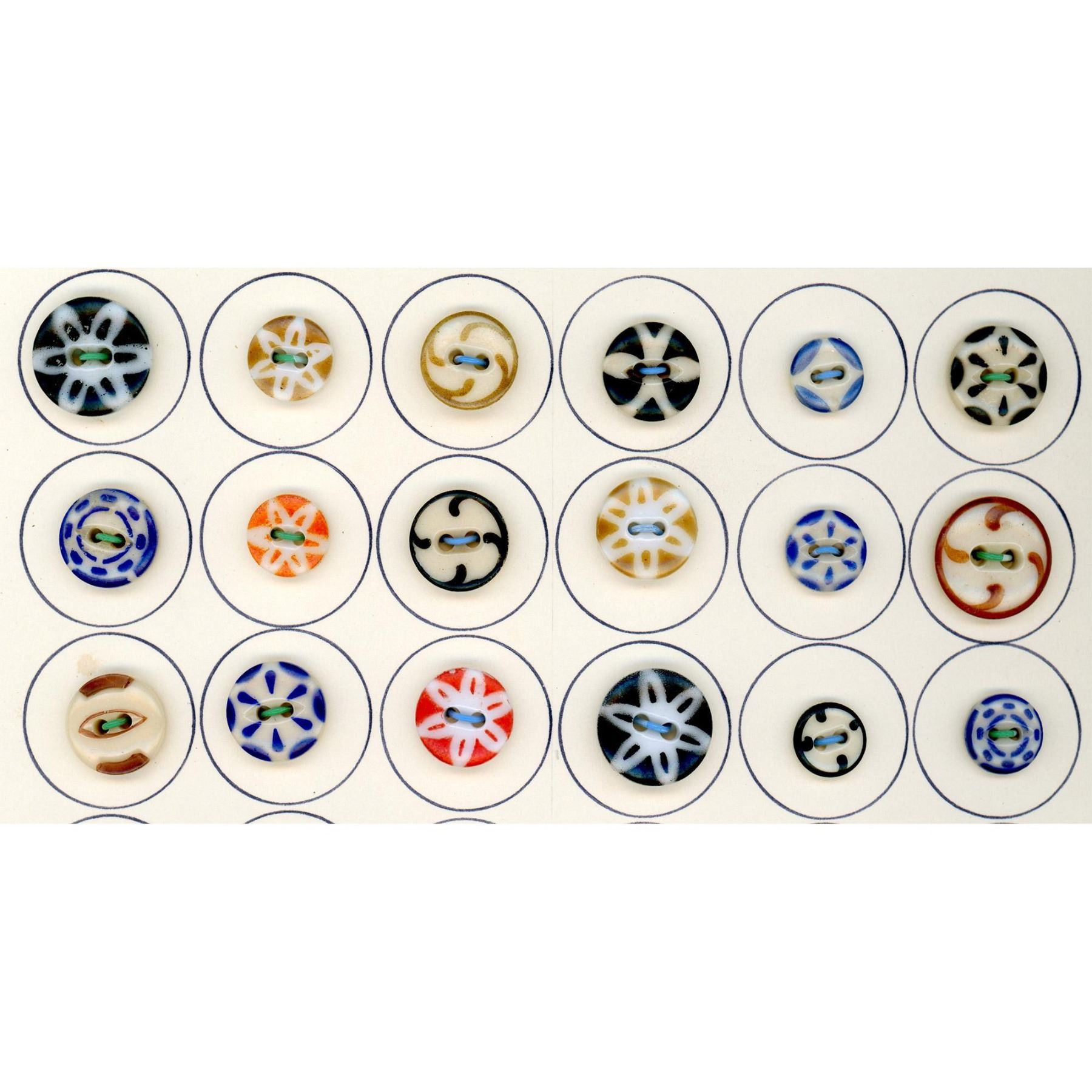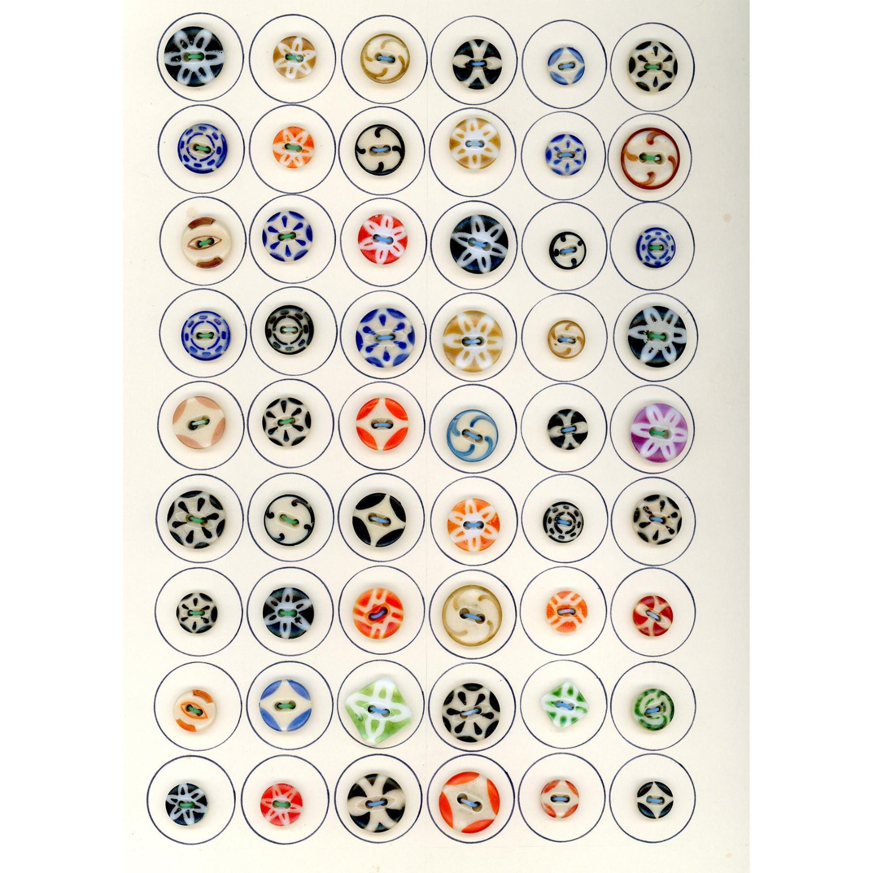 54 Small early 20th C. examples in assorted colors and patterns. Here is a nice selection of these china buttons that many collectors love to collect. This card includes a large selection of patterns and colors.