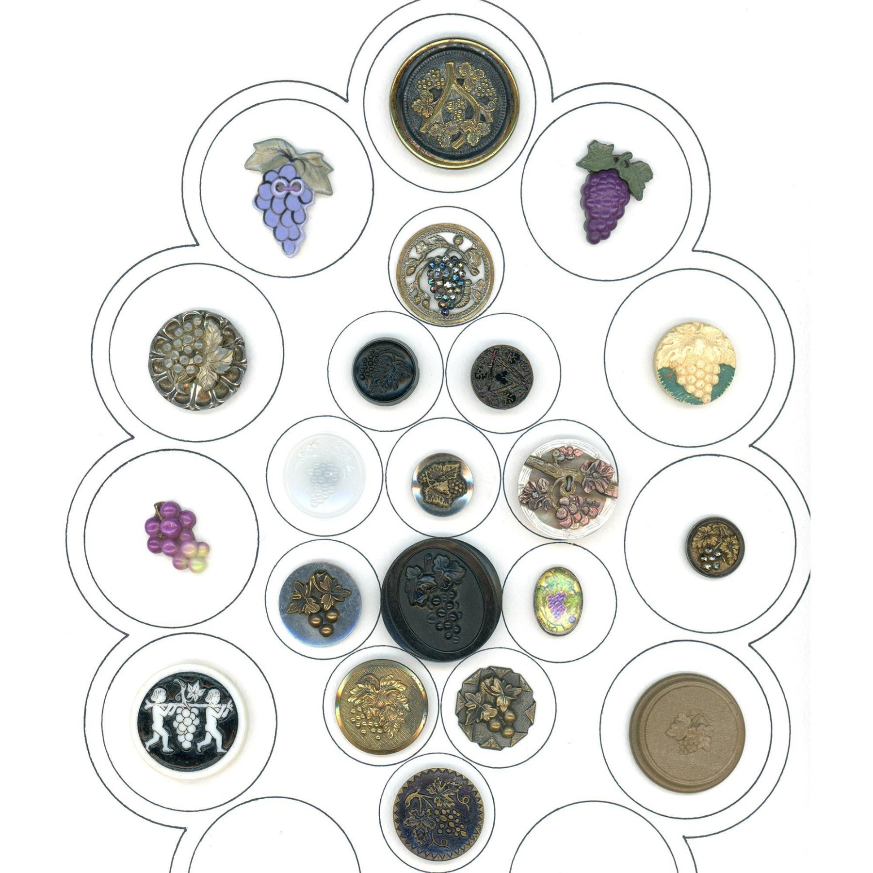 21 S/M/L 19th-20th century assorted materials including Arita. Here is a nice card of assorted material button with Grapes on them. The lot includes a nice Japanese Arita porcelain, a good 19th century brass Handkerchief corner, horn, pewter, plastic and much more,