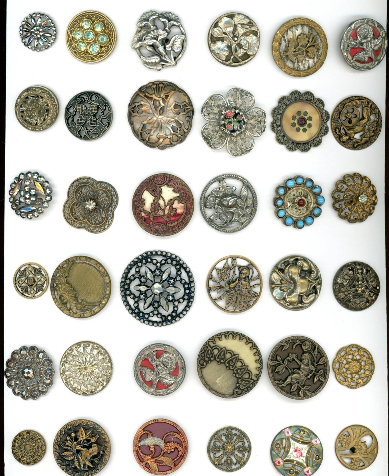 36 Medium/Large 19th-20th century including pictorials. This nice card includes several pierced metals, several Victorian celluloids, enamels, jeweled examples and more.