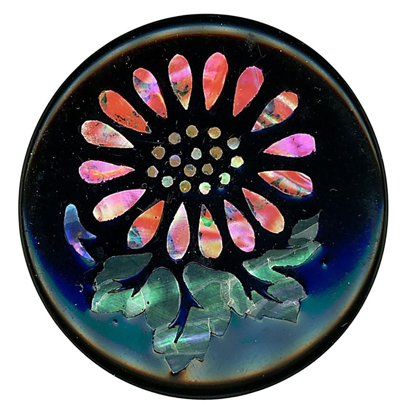 28 S/M/L 19th-20th century assorted material examples. Here is a card of a large variety of materials including Bakelite, Gutta Percha on wood, ceramics, pearl, Cinnabar, enamels, Paperweight glass, glass in metal, horn, Sterling silver, Japanese Satsuma and more,