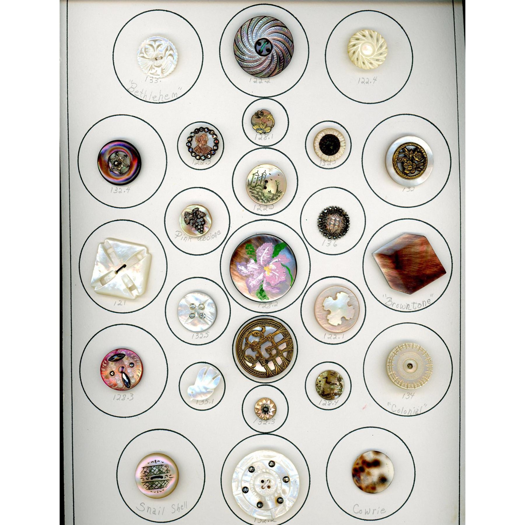 25 S/M/L 19th and 20th century pearl and shell buttons. Here is a nice card of shell including cowrie, green snail and ocean shell. The lot includes some nice examples to add to your collection.