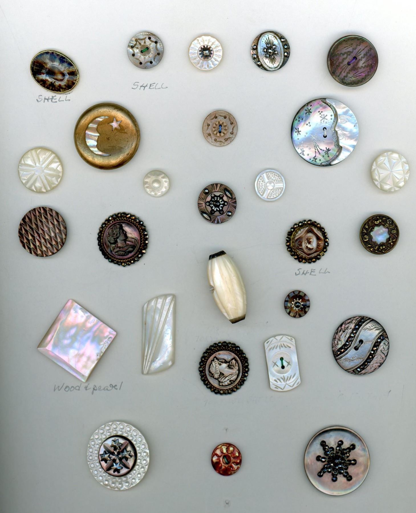 27 S/M/L 19th/20th century examples including Cowrie. This card includes some very nice examples including a wonderfully carved and great shaded Cowrie, a scarce oval Turbo Shell, a cool inlayed brass of a moon and star, laminated, carved and much more.