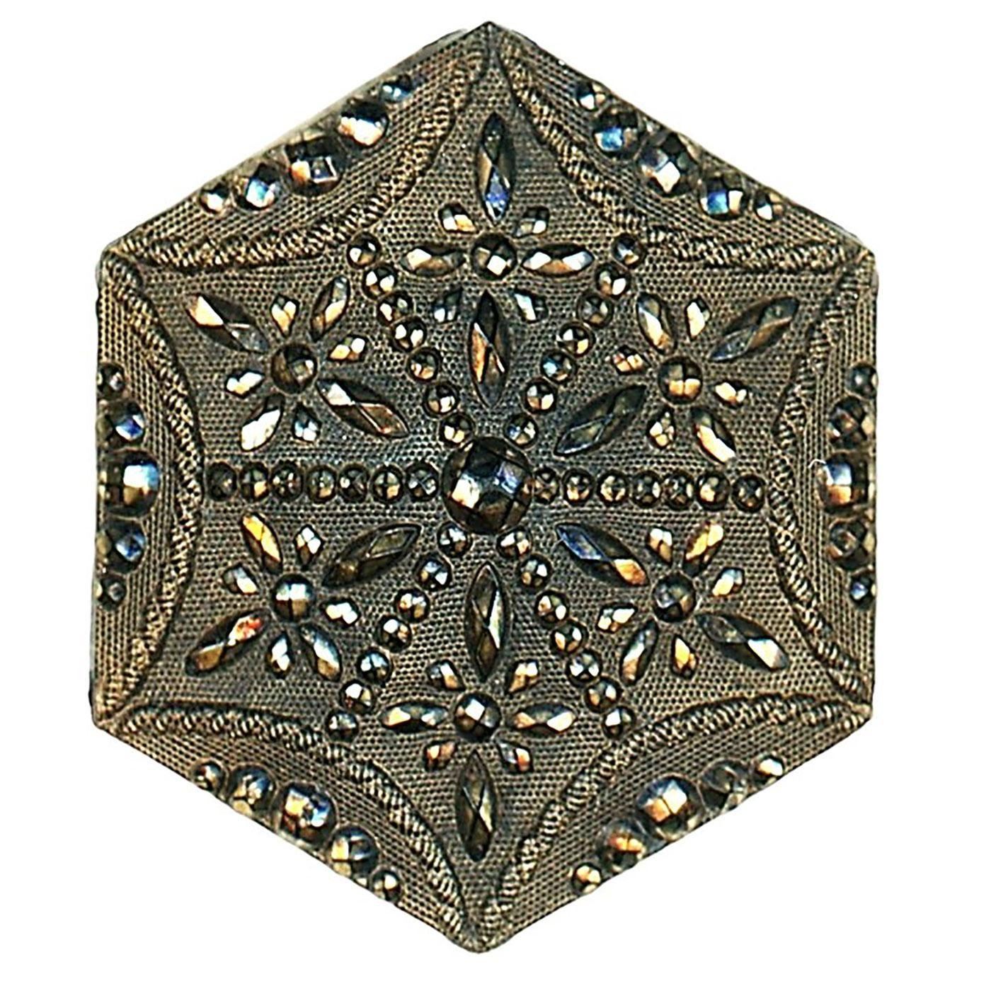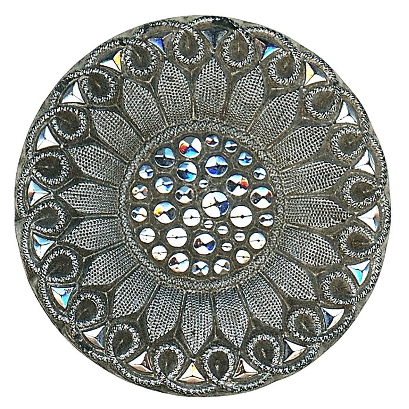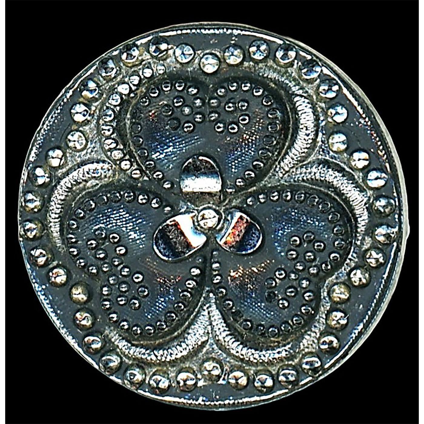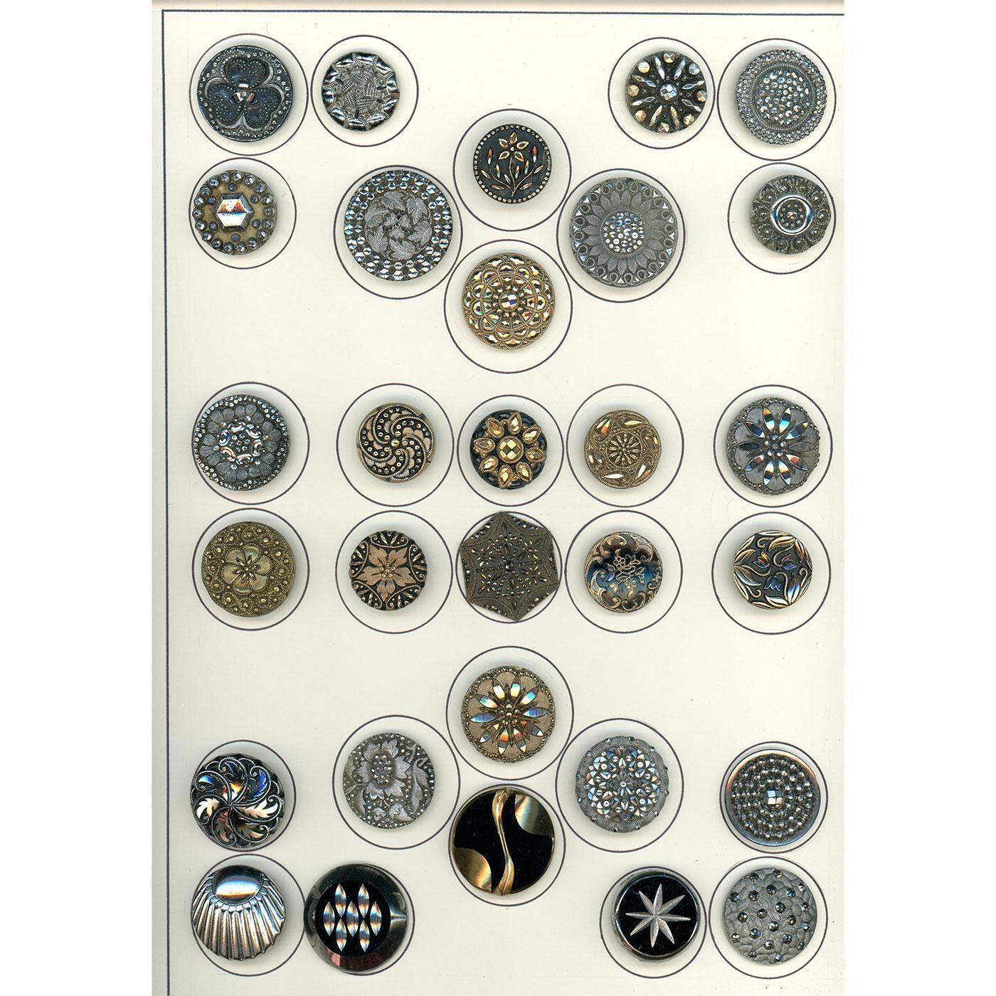 30 Medium size 19th-29th century silver or gold luster examples. This card of medium size black glass buttons includes a selection of silver luster examples and gold luster examples in a variety of styles and patterns including Lacy like. Look closely as Jose Roman compiled a nice selection here. Placed in a standard wood button frame and already to hang on your wall.