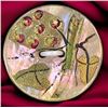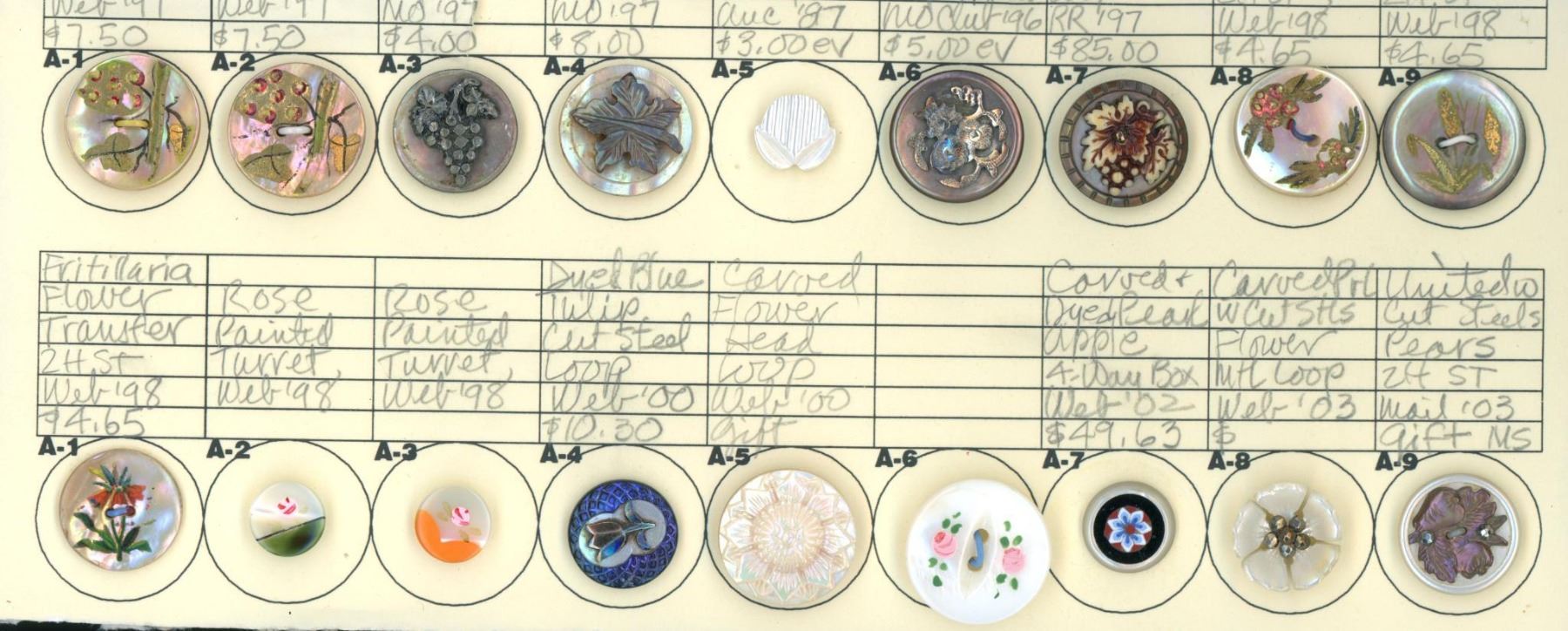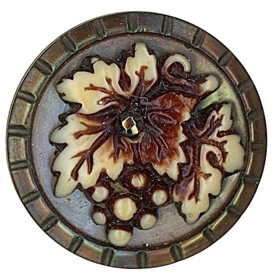 18 Small mostly 19th century assorted technique examples. This partial card from Nikki Deal includes a nice variety of smalls including the fantastic Ivoroid grapes on pearl, the different encrusted examples, a variety of carved, dyed, painted examples along with glass inset. Nice group.