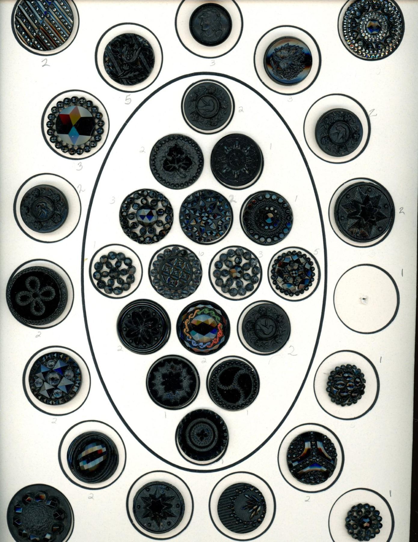 34 S/M/L 19th century assorted techniques in all black. From the collection of the late Paula Norby. This card includes some nice examples including pictorial, lacy like, glued and riveted, pierced and much, much more.