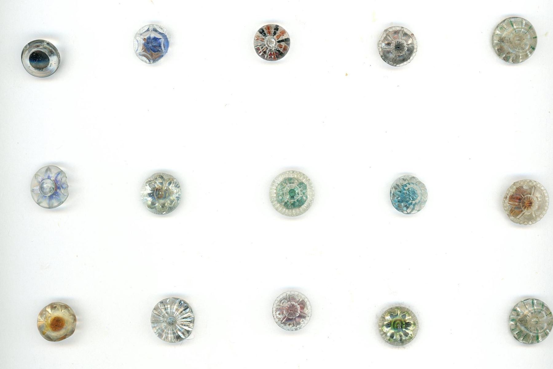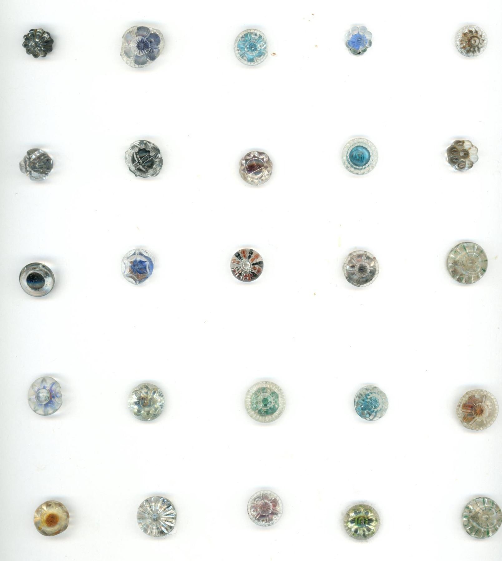 20 Small 19th century examples of Radiant glass. This card from Connie Robinson includes a variety of colored dabbed examples as well as a variety of molded top designs in what collectors call Radiants.