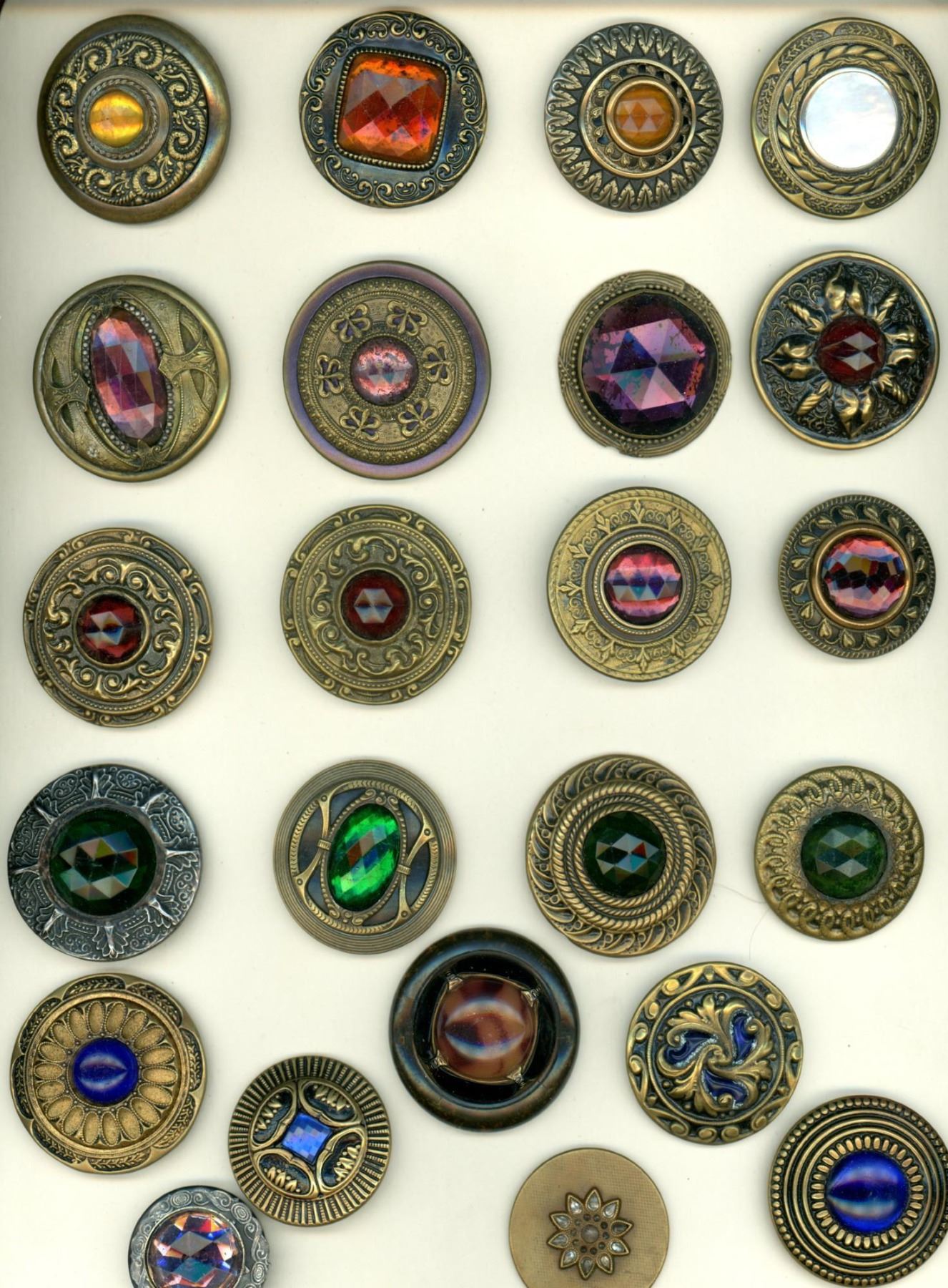 23 Large early 20th century assorted color examples. This is a nice card of a variety of colored glass jeweled buttons known as large jewels in the button world.