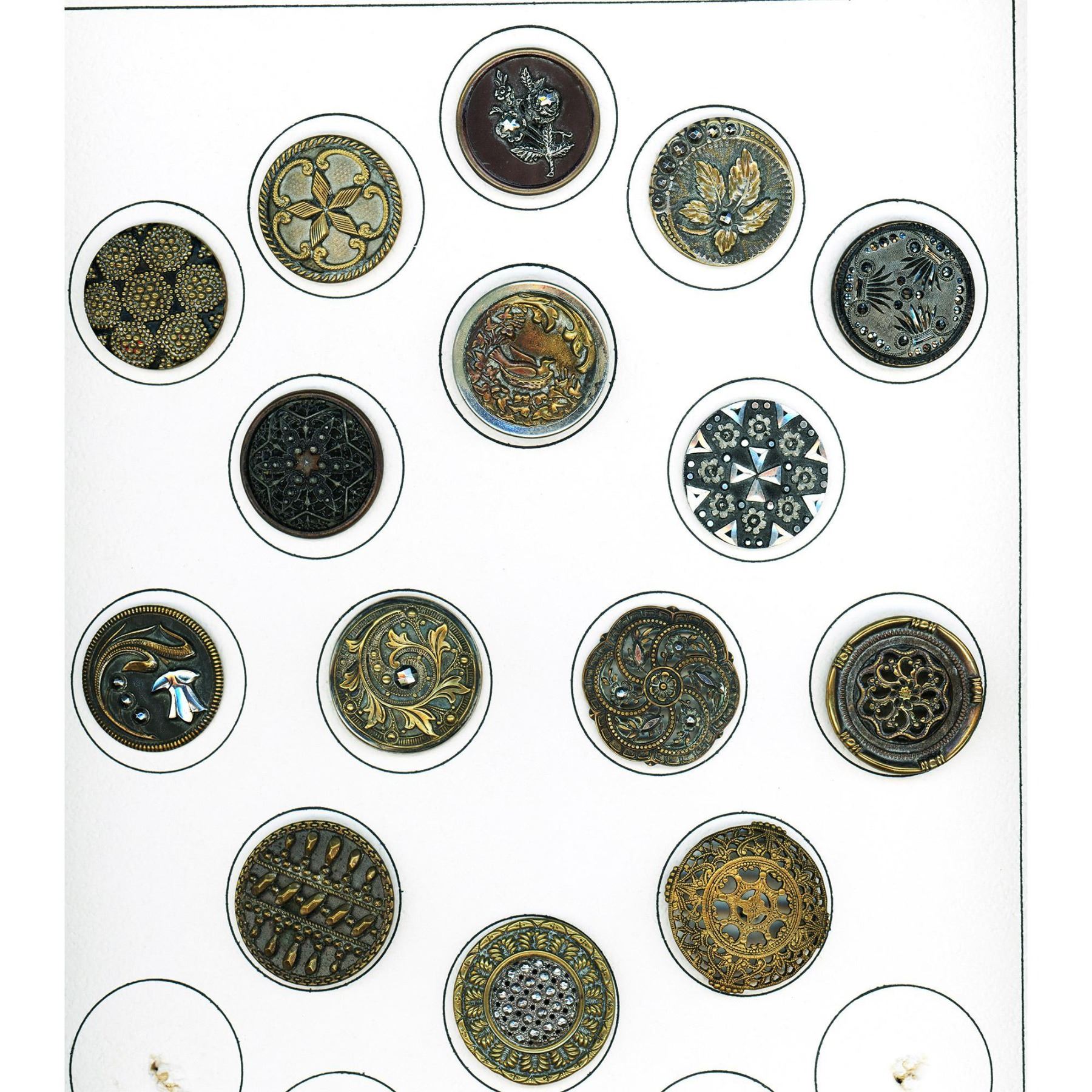 15 Large 19th century buttons including glass in metal. This card includes a lacy style black glass in metal, several pierced metal and several brass with cut steel OME.