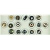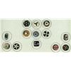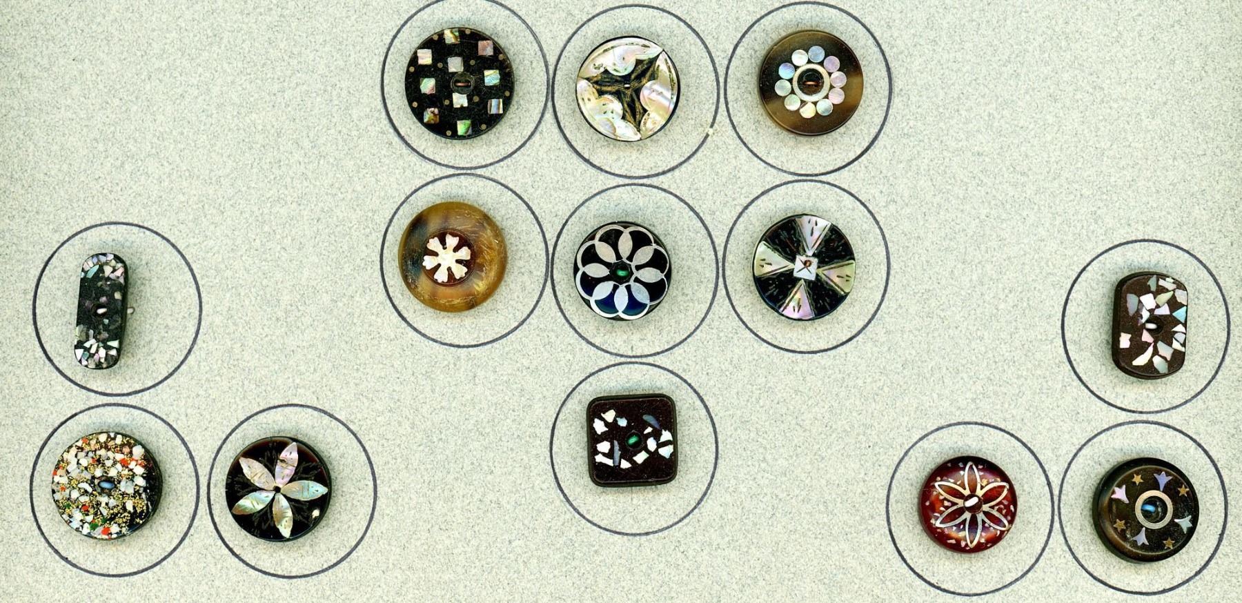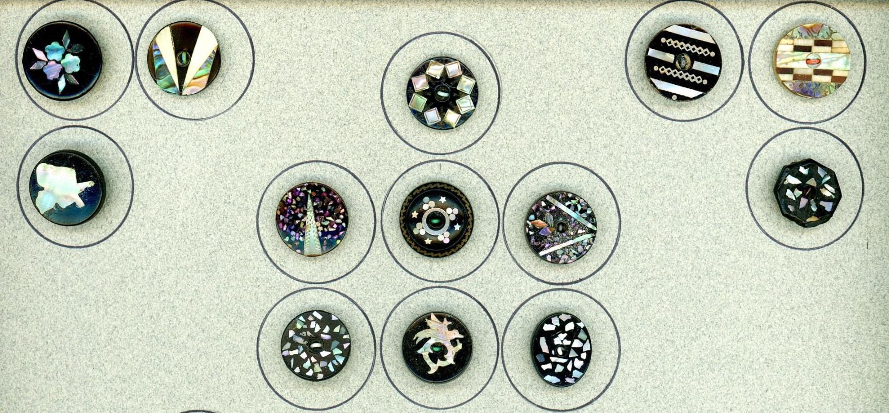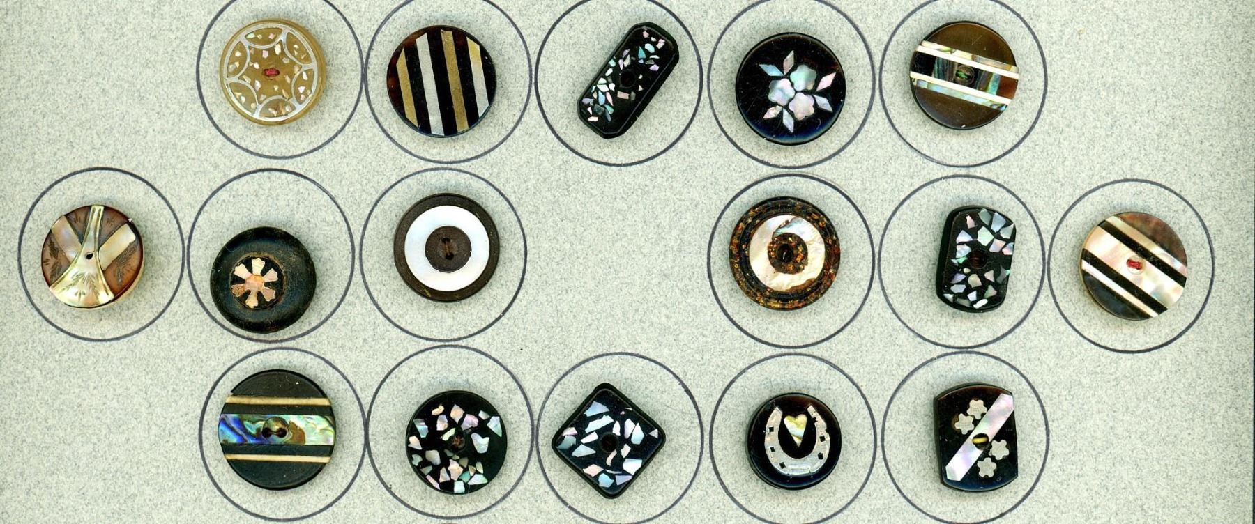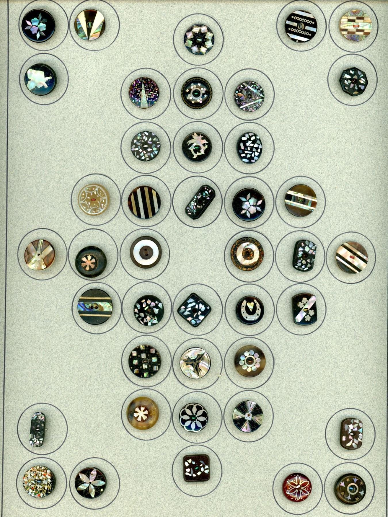 42 Small 19th century horn and compo examples. Here is a very nice card of inlayed metal and or shell/pearl buttons. The lot includes patterns and pictorial and in fine condition.